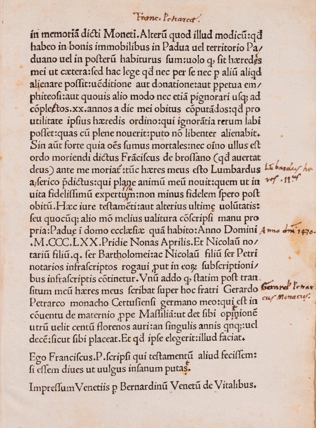 Il testamento a stampa di Francesco Petrarca, una delle poche copie conosciute, dove lascia a Boccaccio 50 fiorini d'oro.