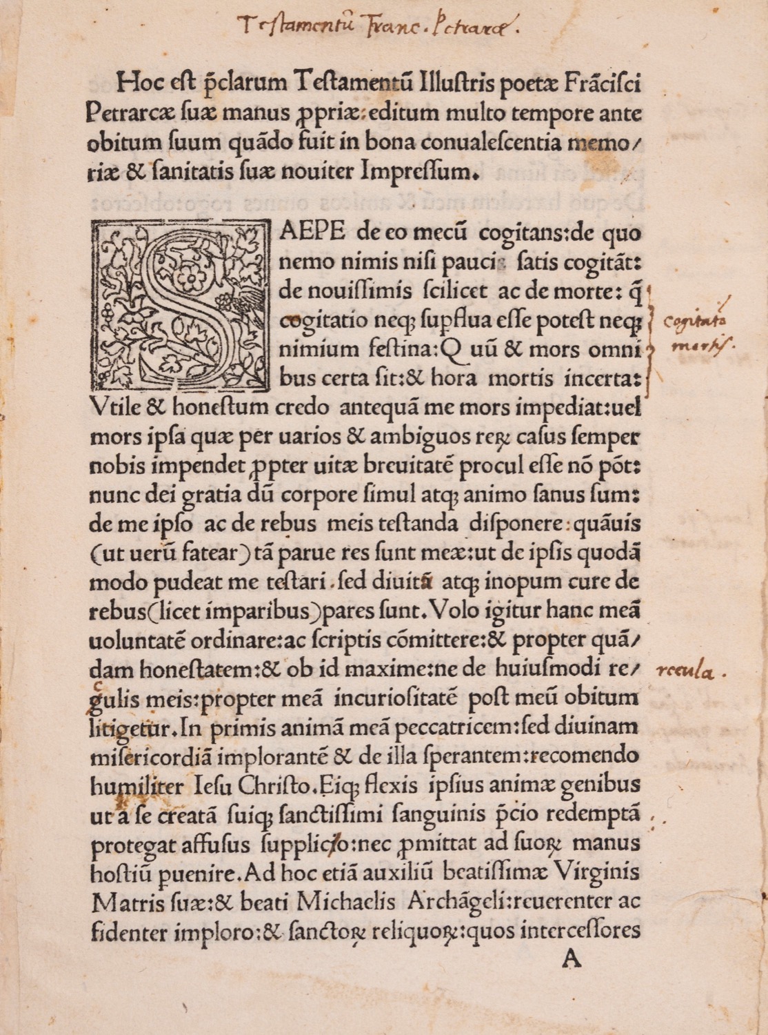 Lotto 6 | Il testamento a stampa di Francesco Petrarca, una delle poche copie conosciute, dove lascia a Boccaccio 50 fiorini d'oro.