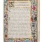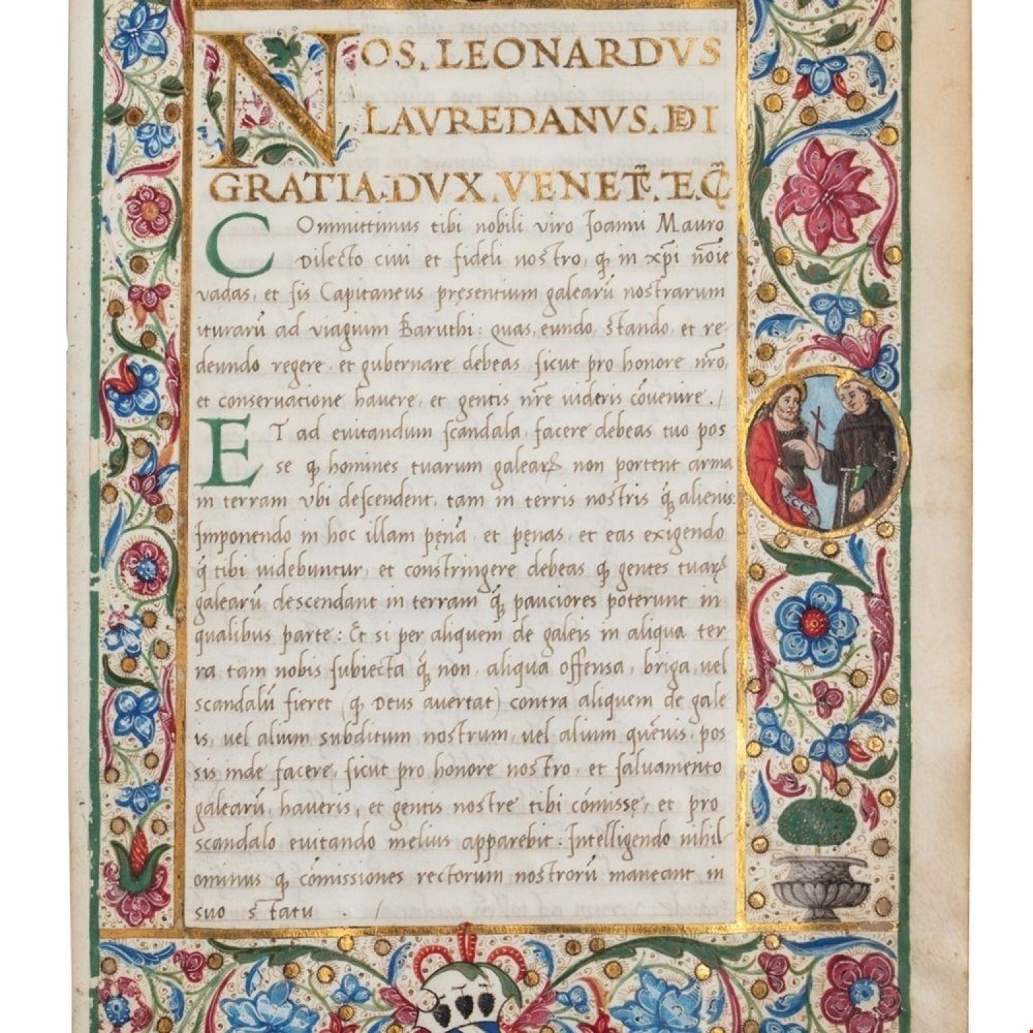 Documento pergamenaceo di 53 carte di cui due bianche (106 pp. in totale), in 4°, 255 x 170 mm., sottoscritto nel Palazzo Ducale di Venezia il 1 di ottobre 1509, in fine una Tabula Presentis Commissionis divisa in duas partes, prima carta con elegante bordura a motivi floreali dipinti in oro, rosso, verde, blu e violetto, tre medaglioni contenenti il Leone di Venezia, lo stemma della famiglia Moro, un'immagine di Cristo con un francescano, testo vergato in una elegantissima scrittura corsiva racchiusa entro uno specchio di scrittura rigato in rosso, legatura in pelle coeva con cornici a secco ai piatti e decorazioni in oro in stile Aldino, con palmette, fiori, losanghe etc.Ex libris al contropiatto: "Caroli Vicecomitis Caburri March.nis".