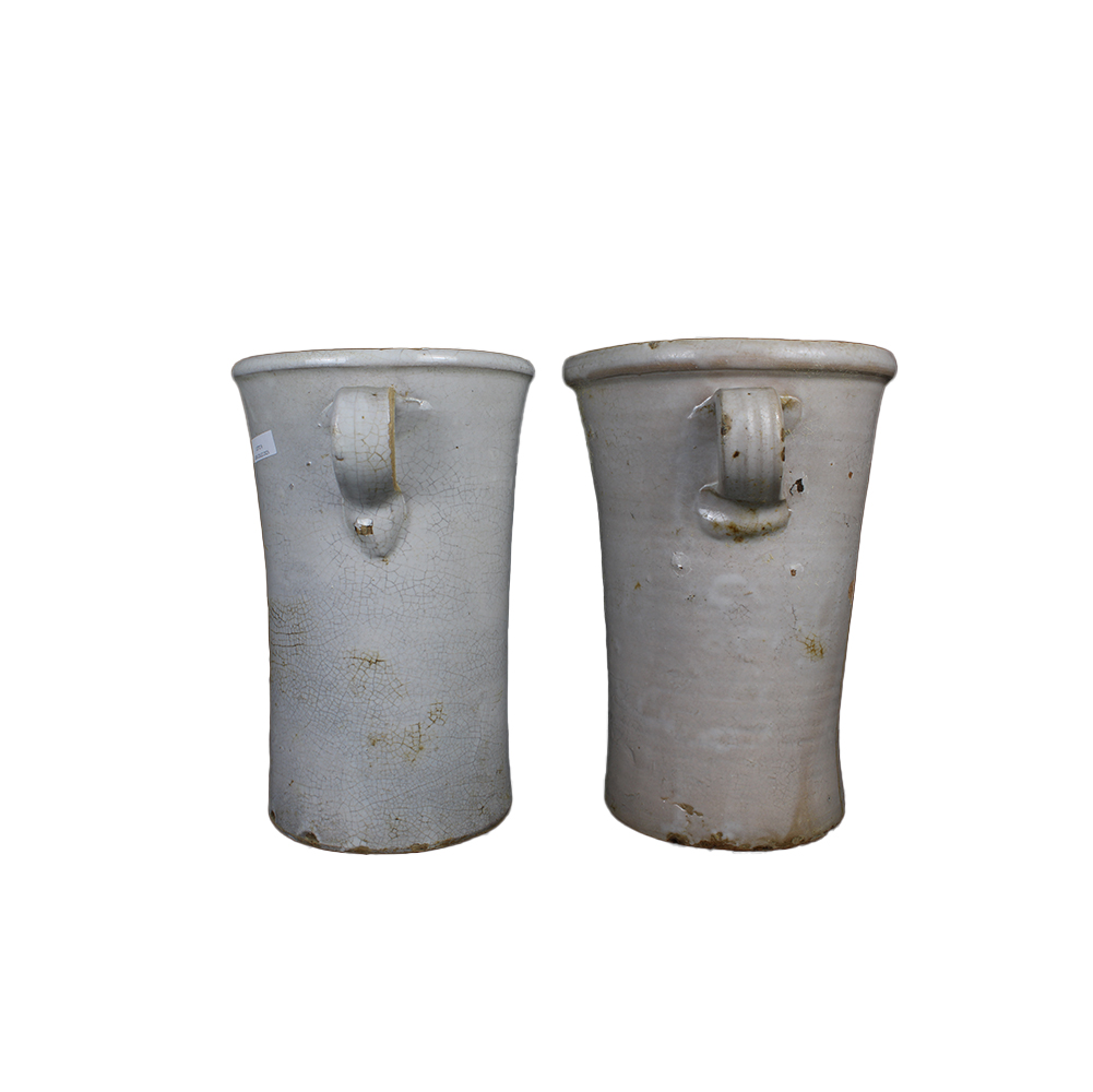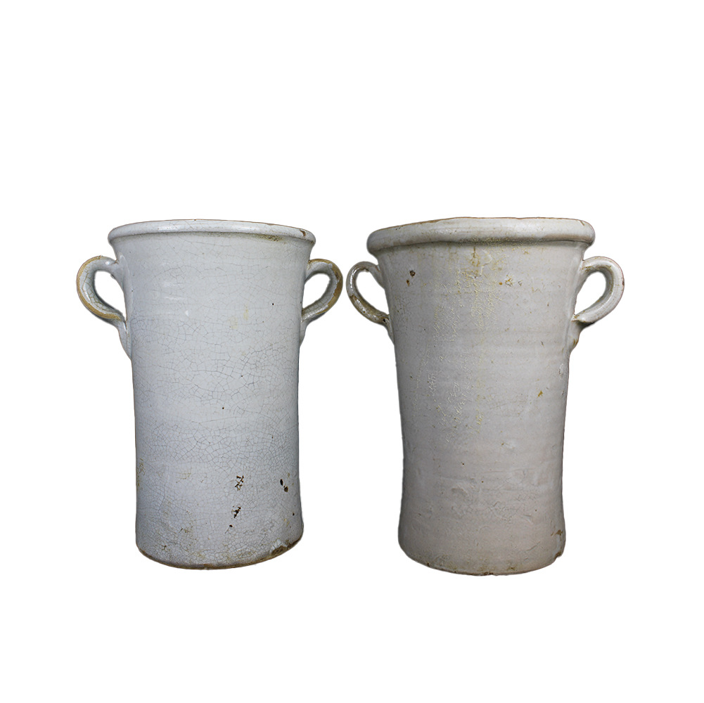 COPPIA VASI SPEZIALI in ceramica smaltata bianca di forma cilindrica con manici laterali maestranze siciliane XIX secolo h cm 29,5 x Ø 25