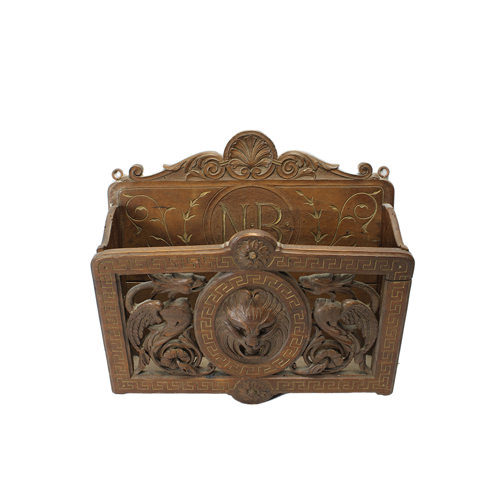 PENSILE PORTALETTERE in legno di noce riccamente scolpito e traforato nella parte centrale mascherone con draghi con lumeggiature in oro maestranze siciliane XIX secolo h cm 29,5 x 33,5 x 10,5