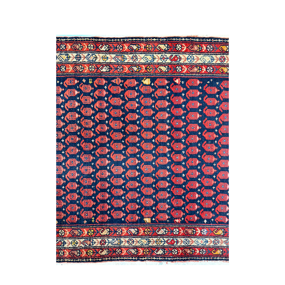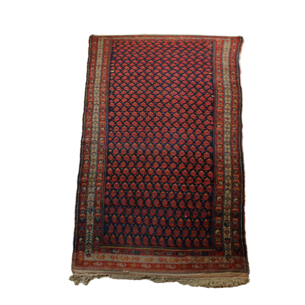 TAPPETO ORIENTALE probabile produzione Caucasia, annodato a mano in lana, bordure multiple floreali e geometriche, usure del tempo metà del XX secolo cm 330 x 110