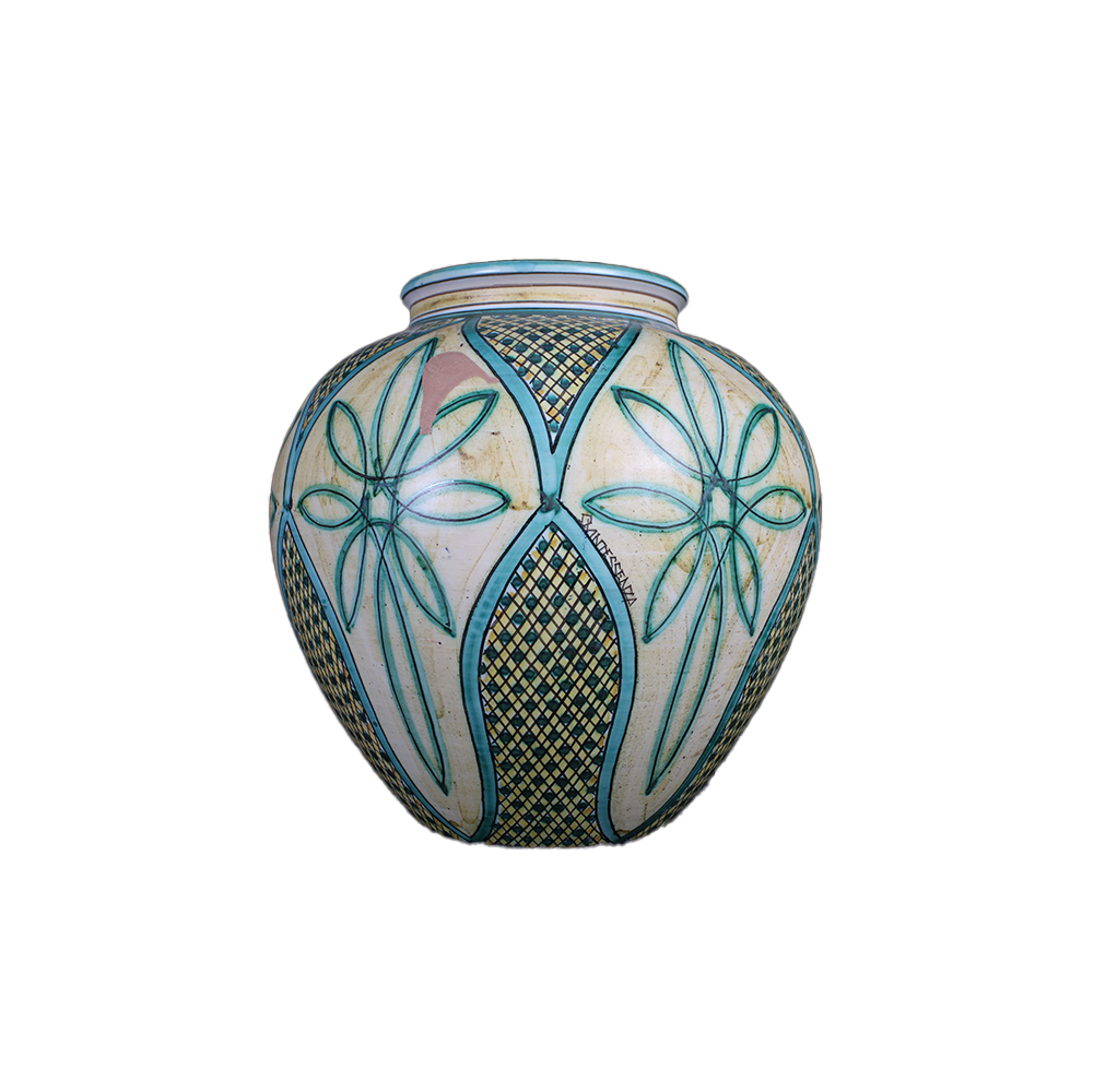 BOCCIA in maiolica dipinta a motivi stilizzati in policromia manifattura 5 assenza firmata Massimo Cappello XX secolo h cm 27 x Ø 30