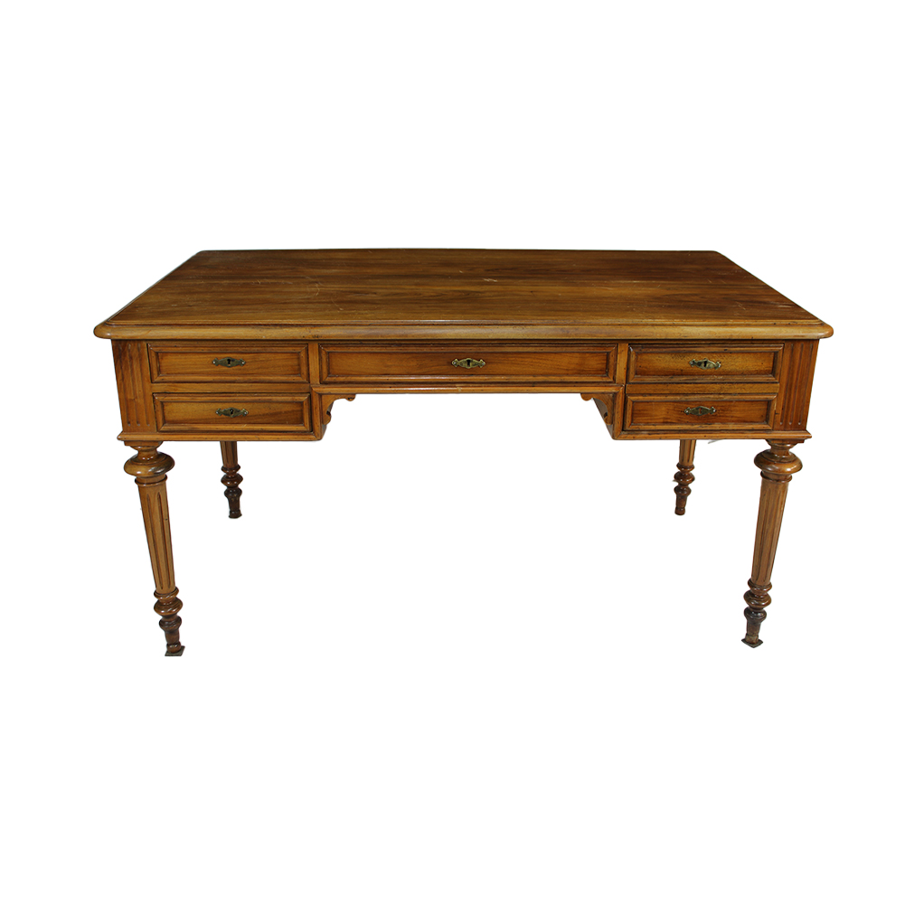 SCRIVANIA in legno di noce a cinque cassetti, uno grande al centro e due per lato, piedi a cono torniti e scanalati Sicilia XIX secolo h cm 82 x 150 x 85