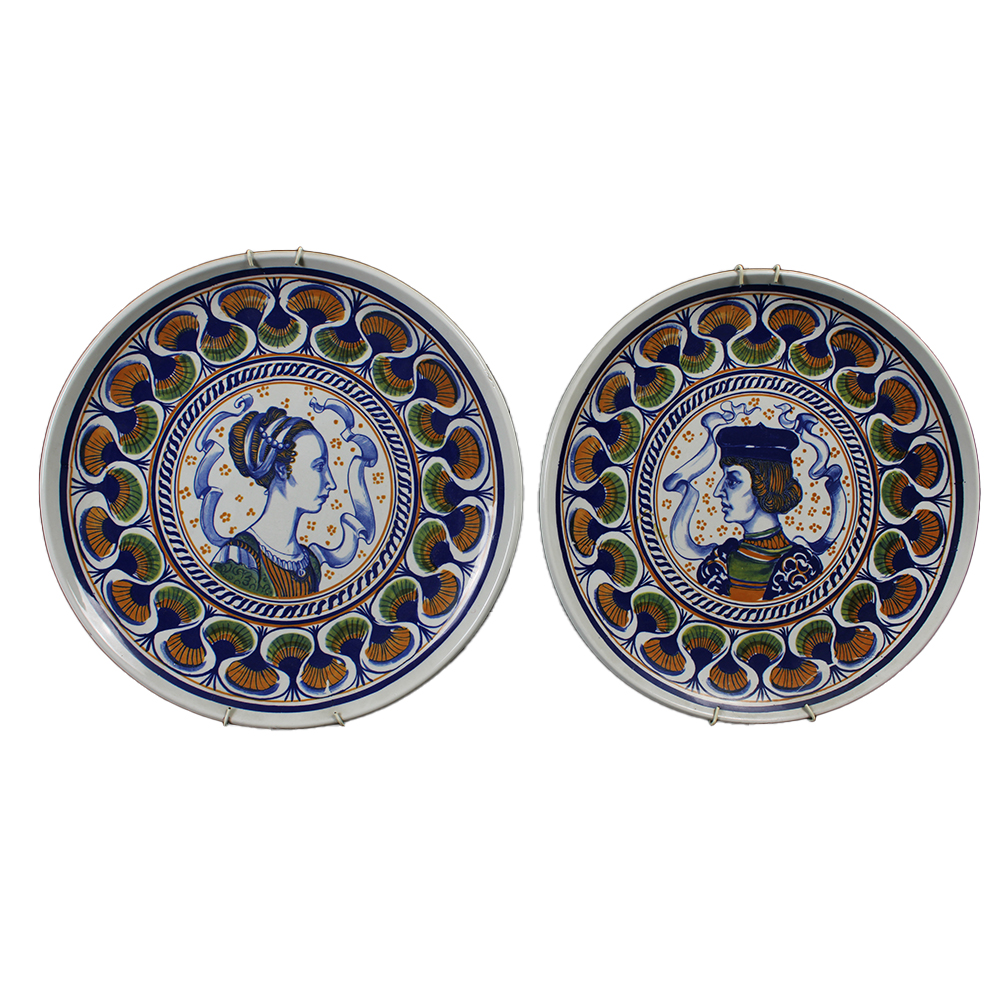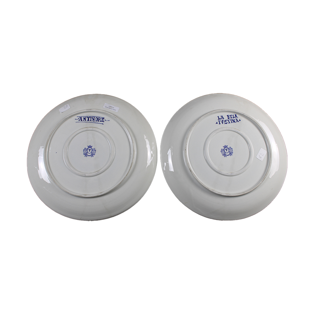 COPPIA DI PIATTI in maiolica policroma dentro riserve raffiguranti Antinore e La bella Iustina manifattura T. Art Alaboration anni 80 cm Ø 30