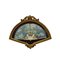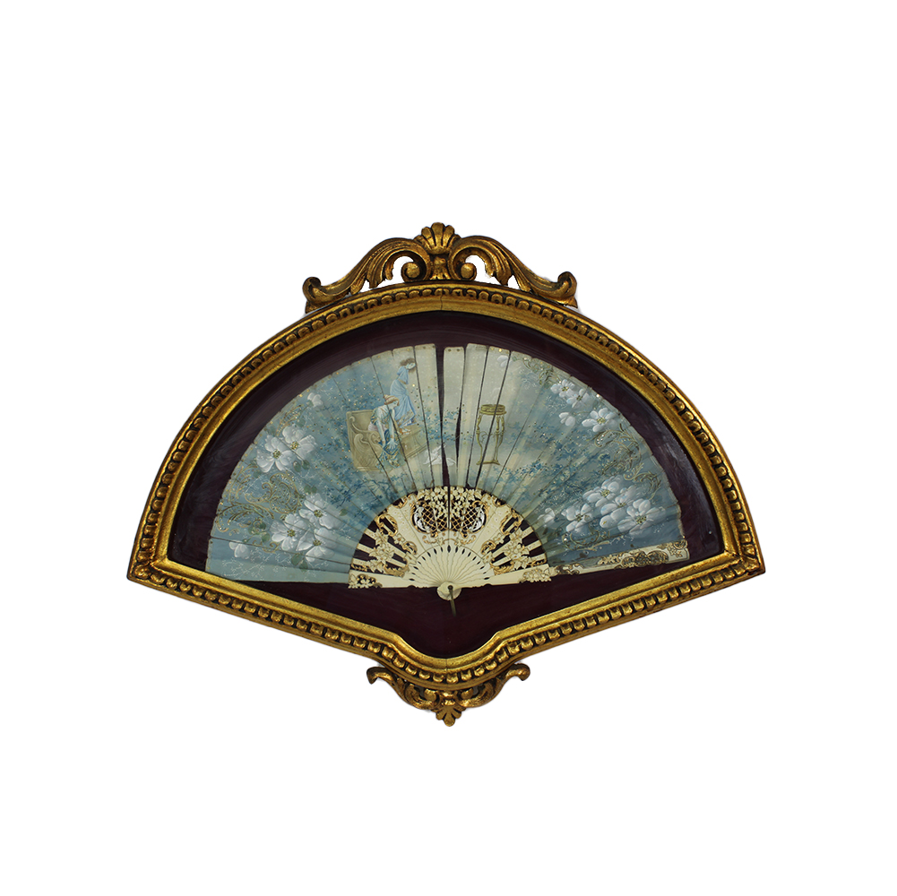 VENTAGLIO con pavè in seta dipinta raffigurante scena di vita e stecche traforate con lumeggiature in oro dentro teca in legno dorato e intagliato Francia XIX/XX secolo ventaglio h cm 25 x 40 - teca h cm 47 x 60