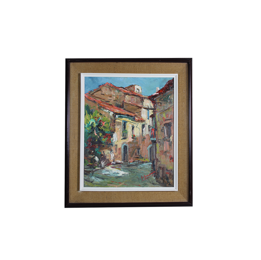 OLIO SU FAESITE raffigurante scorcio di paese, firma indistinta in basso a dx dentro cornice in legno Italia XX secolo h cm 54 x 44 - cornice h cm 75 x 64