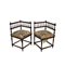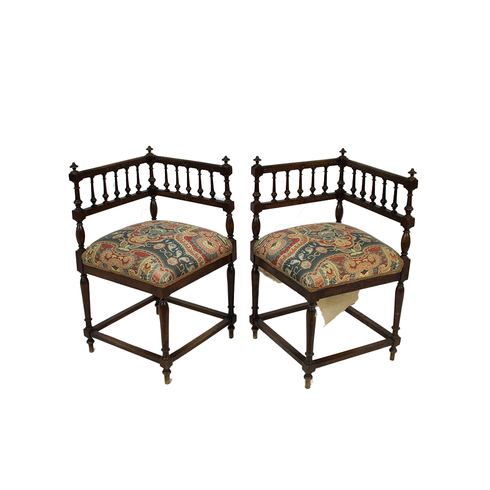 COPPIA SEDIOLINE LUI E LEI in legno di noce tornito e scolpito con spalliera a ringhiera e seduta imbottita Sicilia XIX secolo h cm 66 x 40