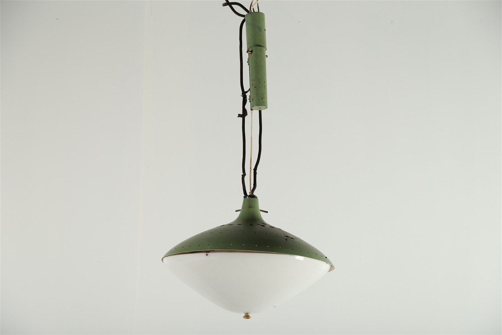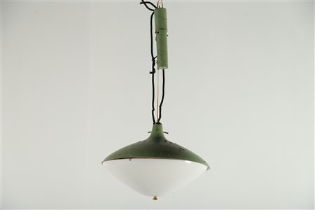 BIANCARDI & JORDAN Lampadario saliscendi. Alluminio laccato e plexiglass. Cm 58,00 x 95,00 x 38,00. Anni '50. Presenta un difetto nel plexiglass.