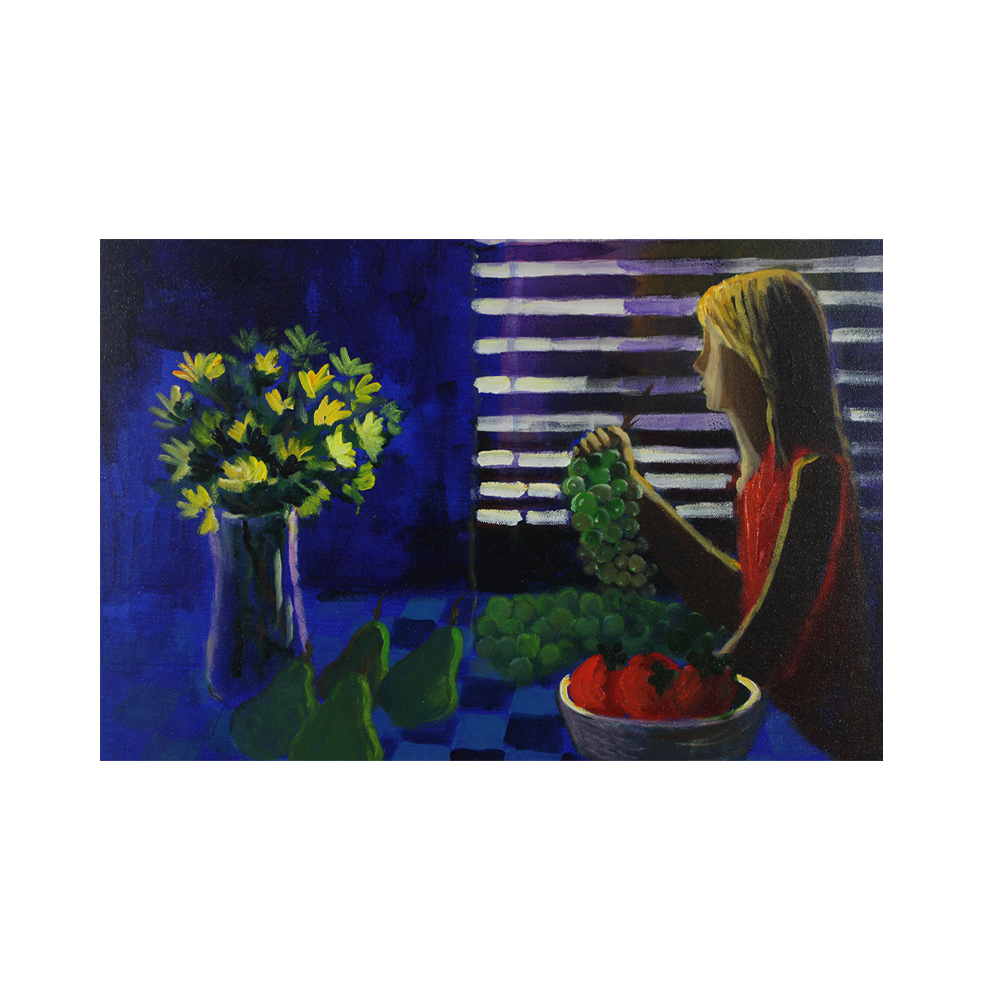 FANTUZZI 1909-1987 olio su tela raffigurante donna con frutta dentro cornice in legno argentato dedica sul retro XX secolo h cm 42 x 62 - cornice h cm 74 x 95