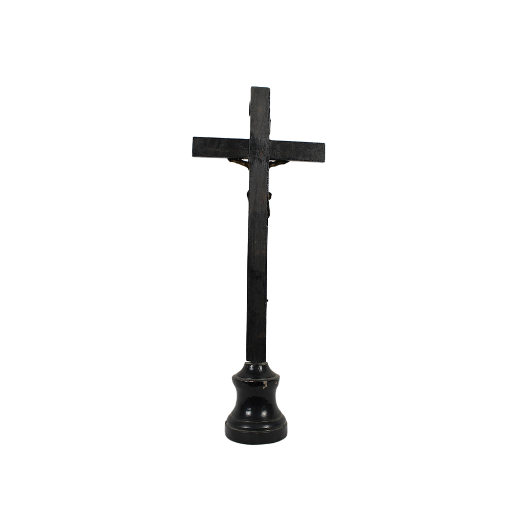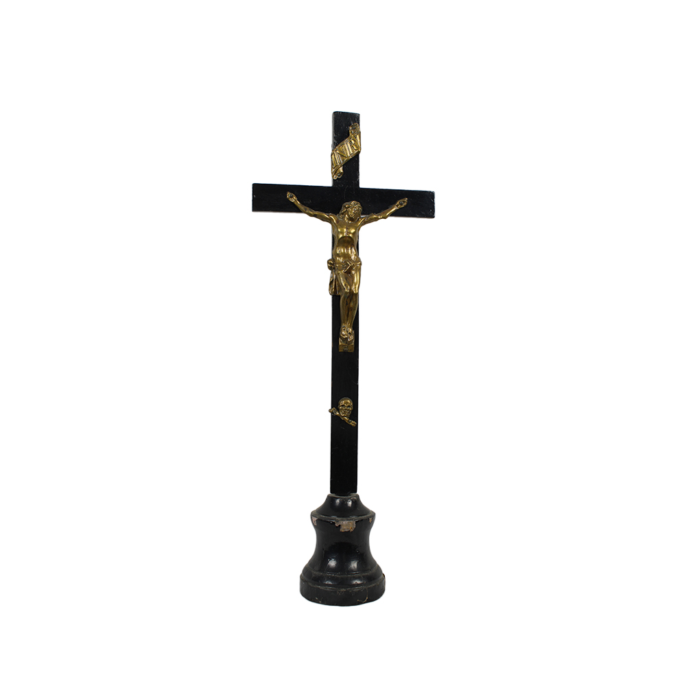 CROCIFISSO in metallo sbalzato e dorato con croce e base in legno ebanizzato Sicilia primi 800 h cm 39 x 15 x 7