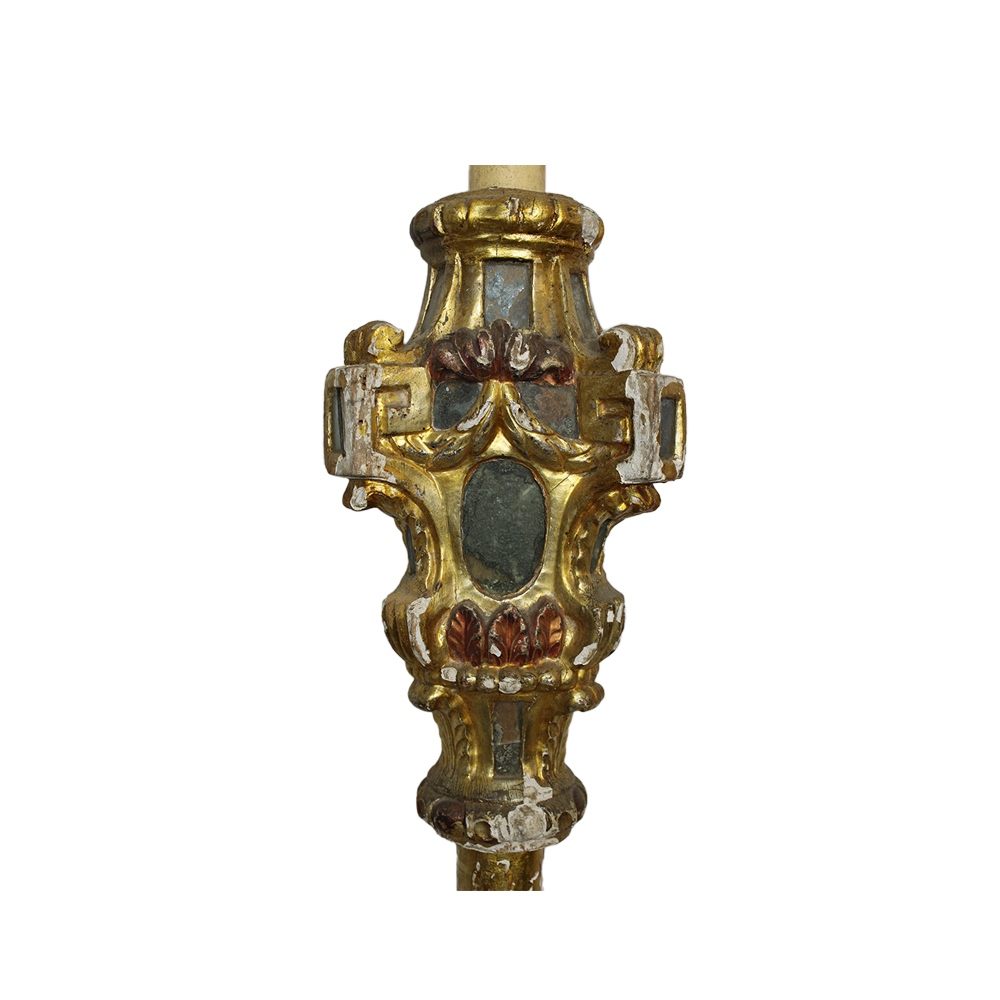 COPPIA DI TORCERI DA PROCESSIONE in legno dorato e laccato, usure del tempo e mancanze h cm 153 x Ø 16
