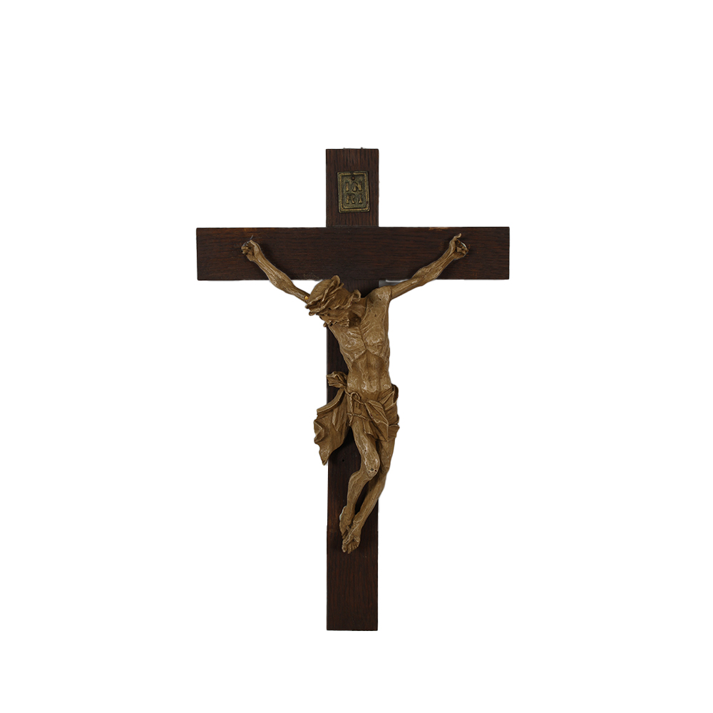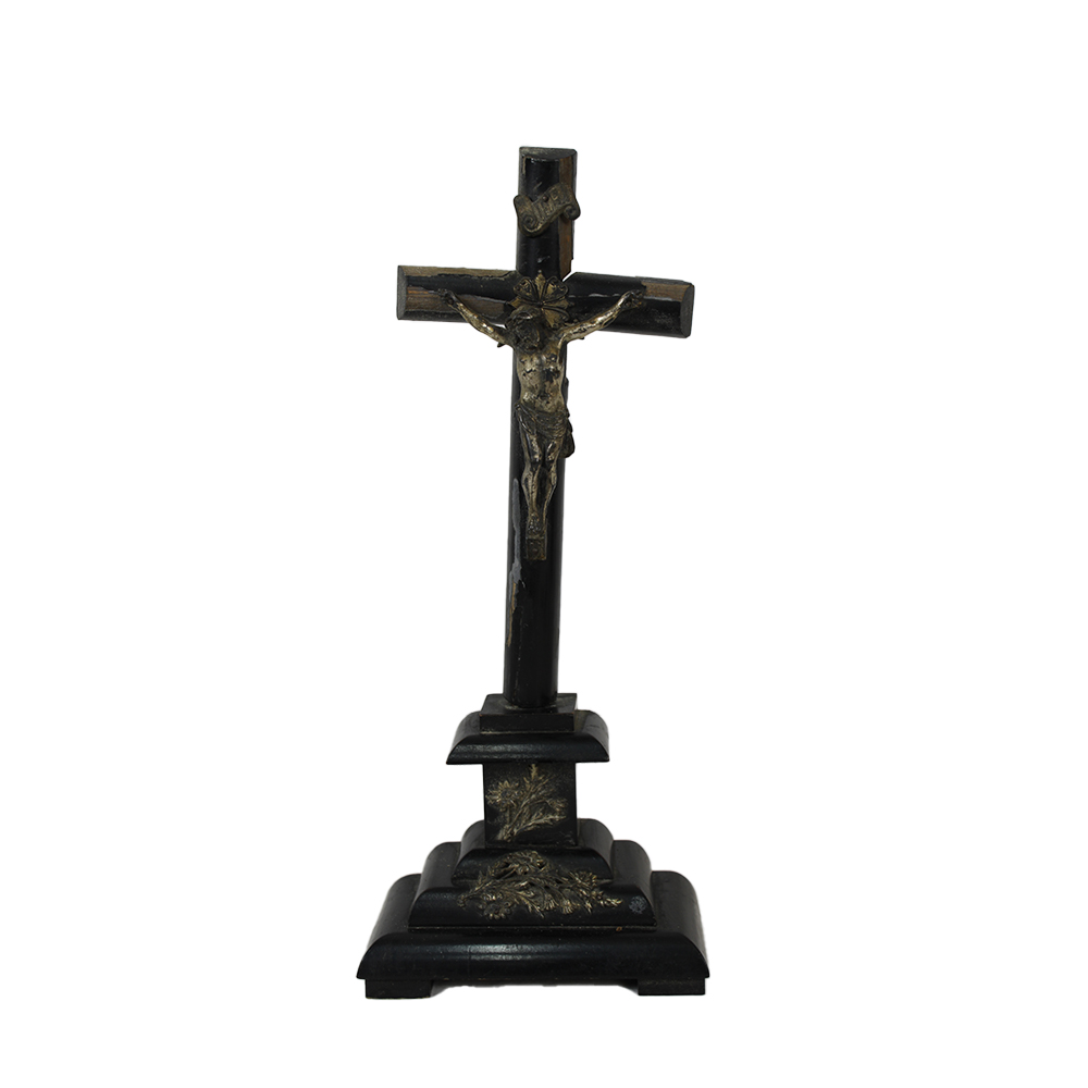 LOTTO COMPOSTO DA 1 crocifisso d'appoggio con Cristo in metallo argentato e base in legno ebanizzato ed 1 crocifisso in legno laccato con croce in rovere Italia XIX/XX secolo h cm 34 - h cm 36