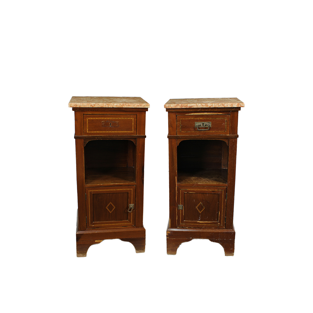 COPPIA DI COMODINI LIBERTY in legno di noce e perfili a marcquettatura in varie essenze , 1 cassetto ed 1 sportello nella parte inferiore, piano in marmo rosso di Verona Sicilia primi 900 h cm 95 x 44 x 36
