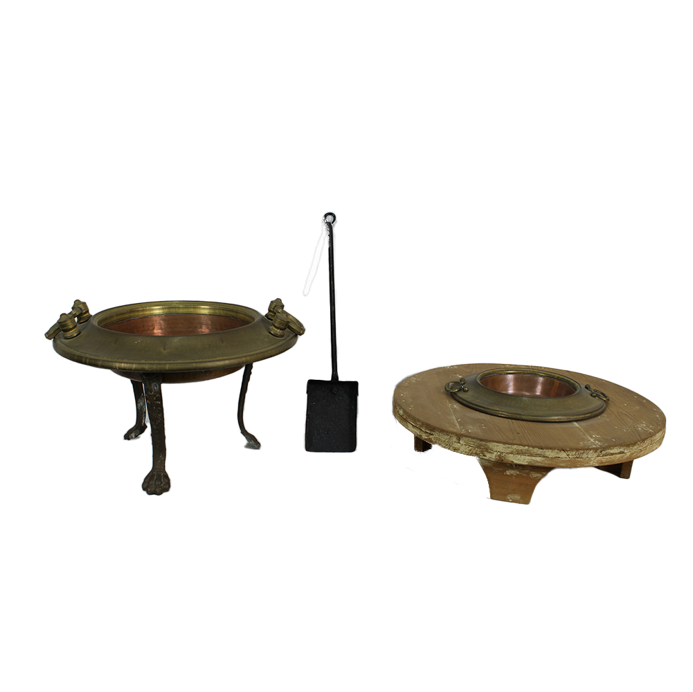 LOTTO COMPOSTO DA 1 braciere in ottone e rame, 1 braciere in ottone rosso e base in legno ed 1 paletta in ferro maestranze siciliane primi 900 misure varie