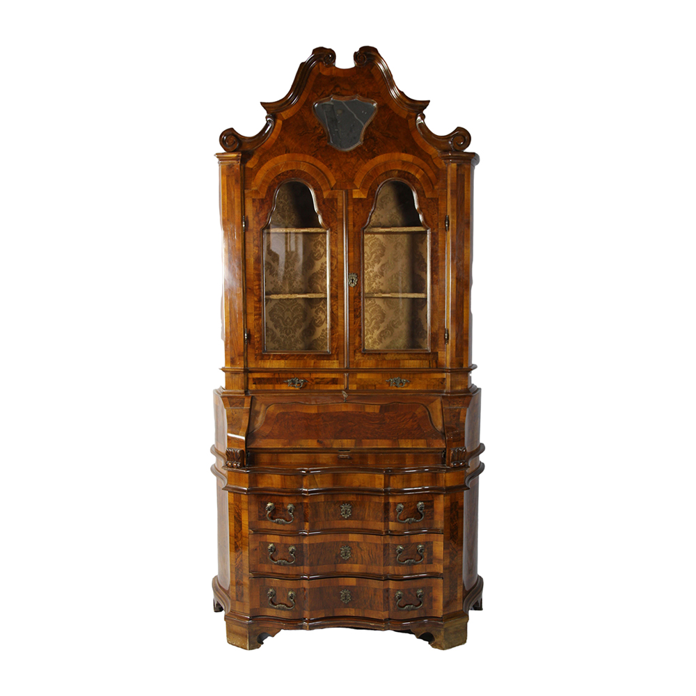 TRUMEAU STILE VENEZIANO lastronato in diverse essenze, presenta sul fronte tre cassetti sormontati da un'anta a ribalta celante uno scarabattolo con cassetti e vani, l'alzata a due ante con vetri e cimasa modanata ebanisteria italiana XX secolo h cm 240 x 120 x 47