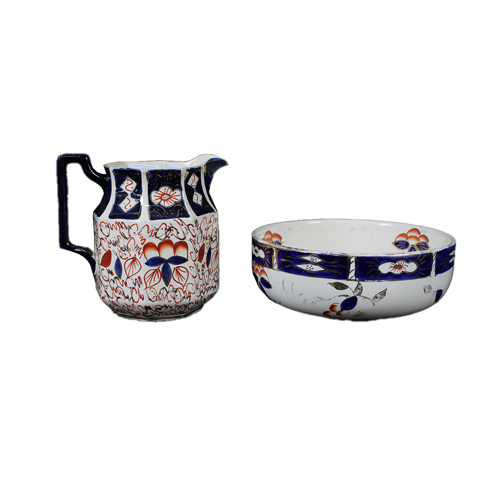 BROCCA E BACILE in porcellana dipinta in policromia e lumeggiature in oro, manifattura WADEHEATH, lieve sbeccatura nel bordo interno della caraffa Inghilterra primi 900 misure varie