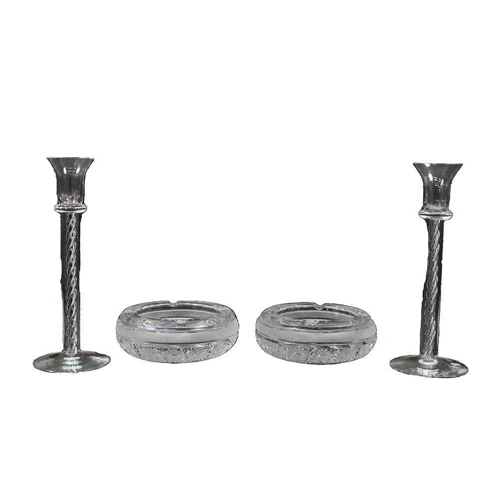 LOTTO COMPOSTO DA 2 posacenere in cristallo intagliato e una coppia di candelabri monocera in vetro XX secolo misure varie