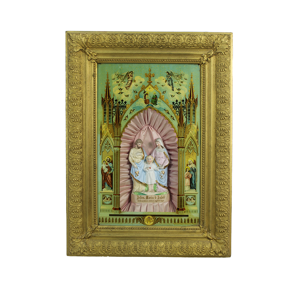 SACRA FAMIGLIA in biscuit dentro cornice in legno e pastiglia dorata Francia primi 900 h cm 76 x 55