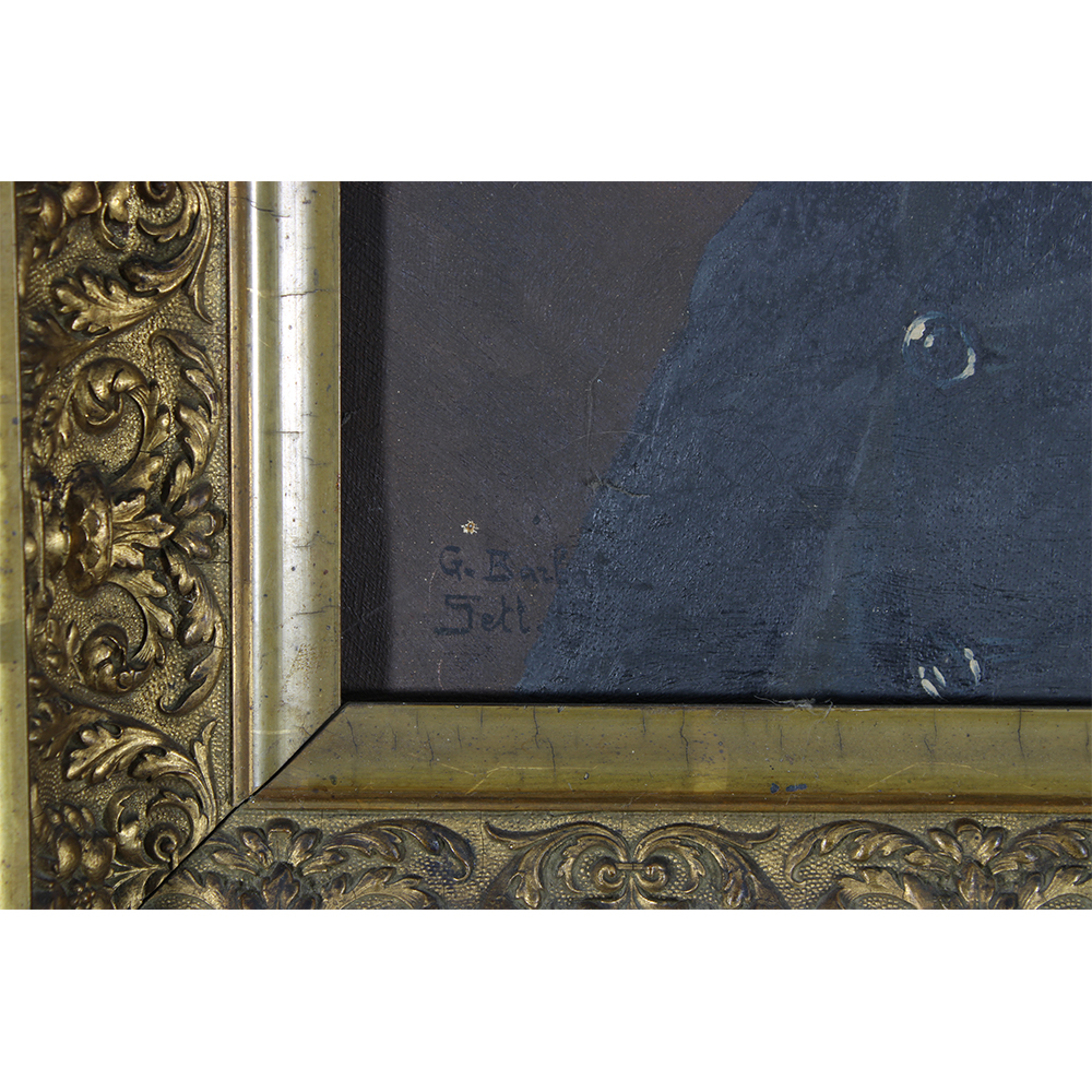 OLIO SU TELA raffigurante ritratto di uomo dentro cornice in legno e pastiglia dorata, firma indistinta XIX/ XX secolo h cm 65,5 x 50 - cornice h cm 82,5 x 67