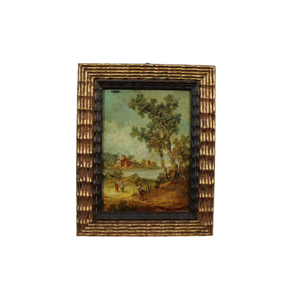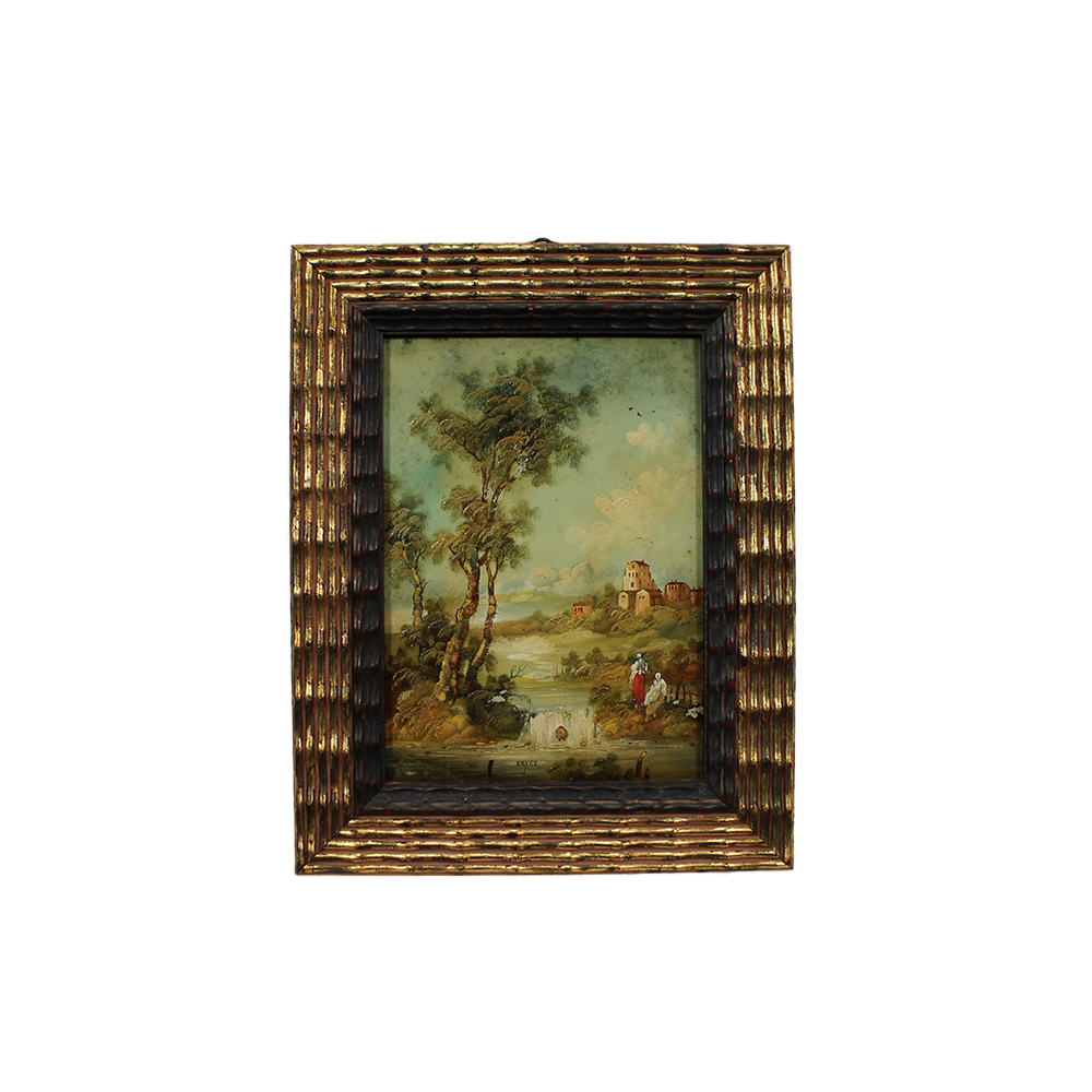 COPPIA DI DIPINTI SU RAME raffiguranti paesaggi dentro cornici in legno laccato e dorato XX secolo h cm 24 x 19,5