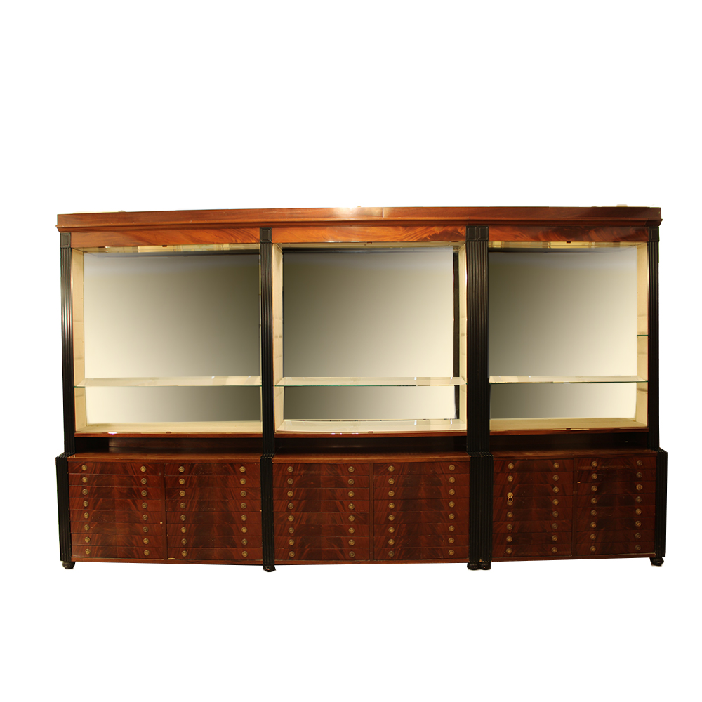 GRANDE VETRINA ESPOSITIVA A DOPPIO CORPO parte inferiore con cassetti e parte superiore a giorno di gusto Impero in piuma di mogano e legno ebanizzato con maniglie in bronzo dorato maestranze siciliane primi 900 h cm 250 x 421 x 42,5