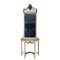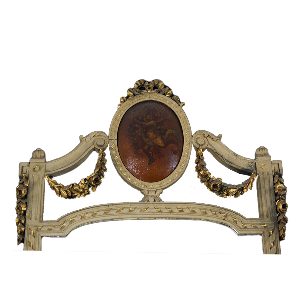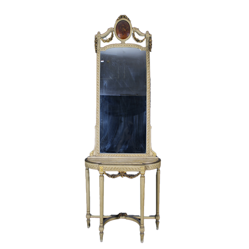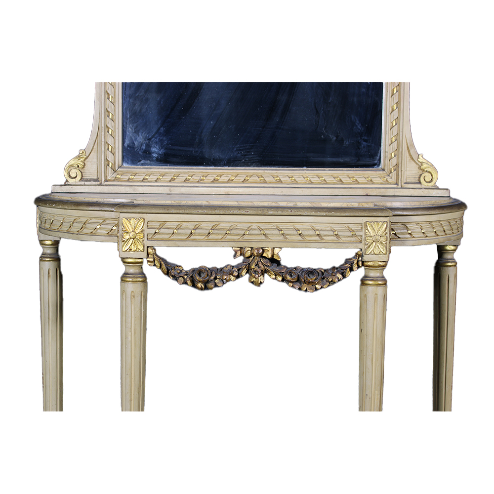 CONSOLLE CON SPECCHIERA in legno scolpito a motivi floreali e nastrini laccati e dorati, cimasa della specchiera decorata da dipinti raffigurante putti maestranze siciliane II metà del XIX secolo h cm 295 x 102 x 38