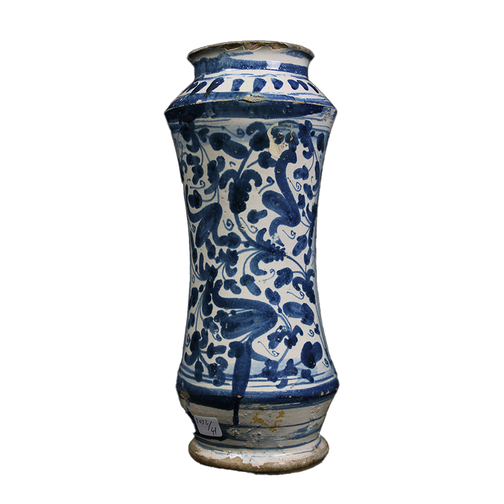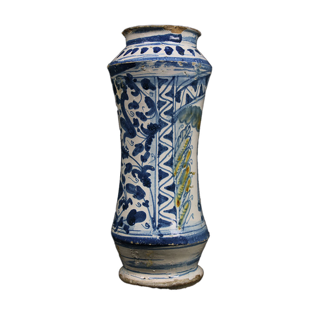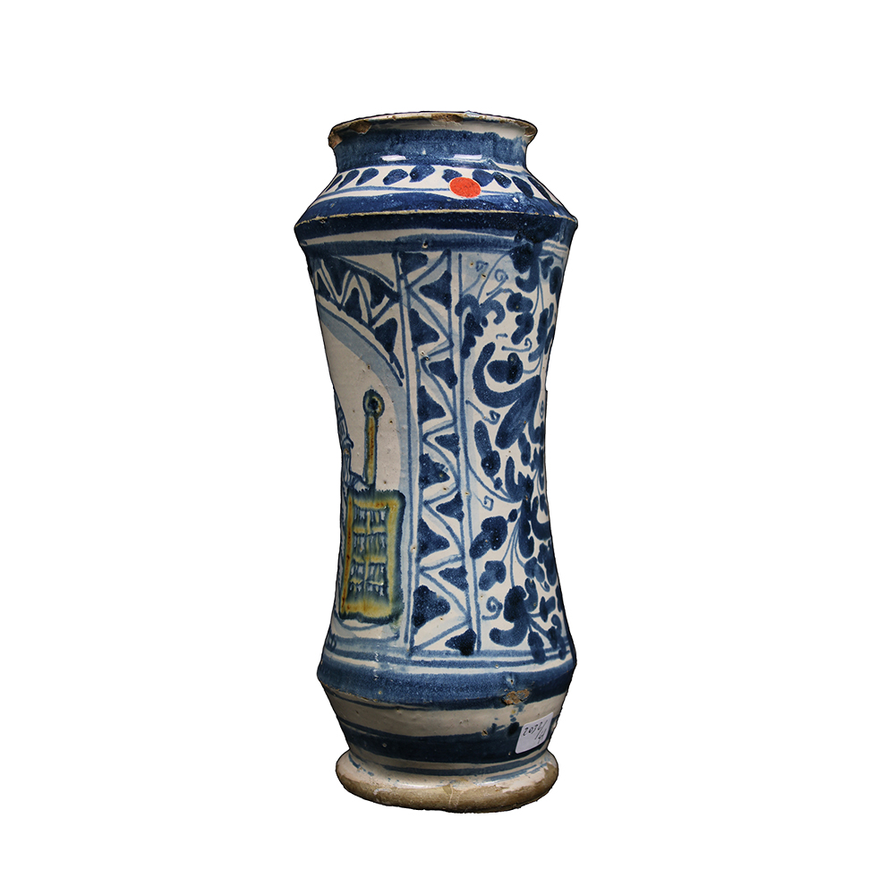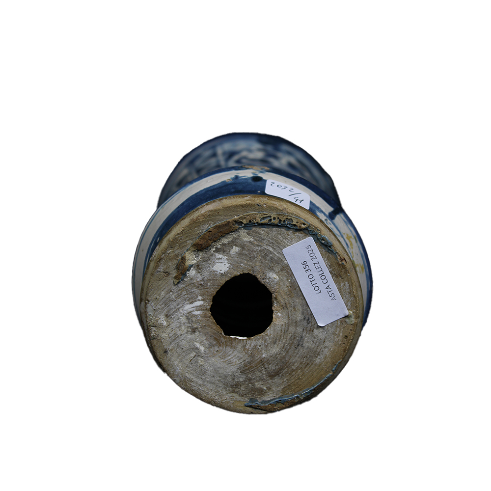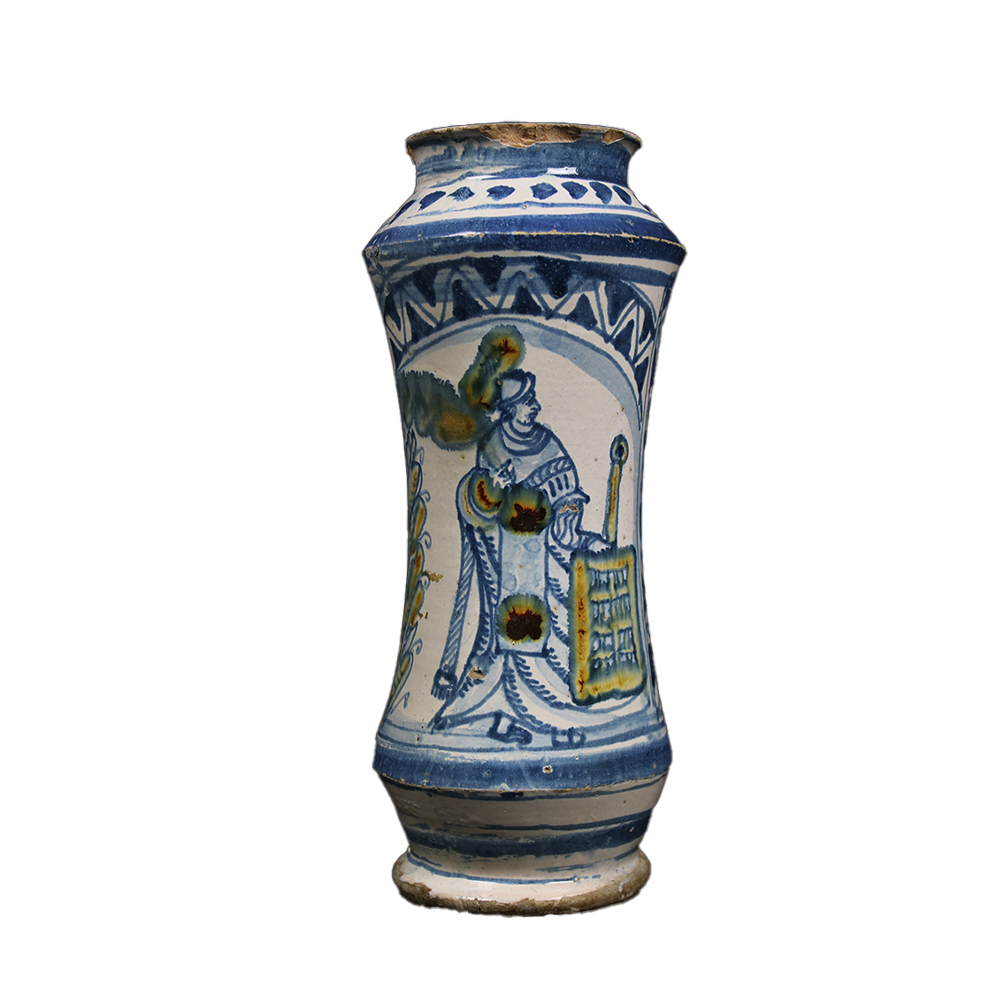 ALBARELLO in maiolica dipinta dentro riserva raffigurante personaggio (fondo bucato e sbeccature sul bordo) manifattura Caltagirone XVI/XVII secolo h cm 27,5 x 11,5