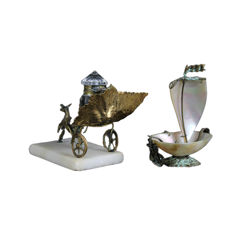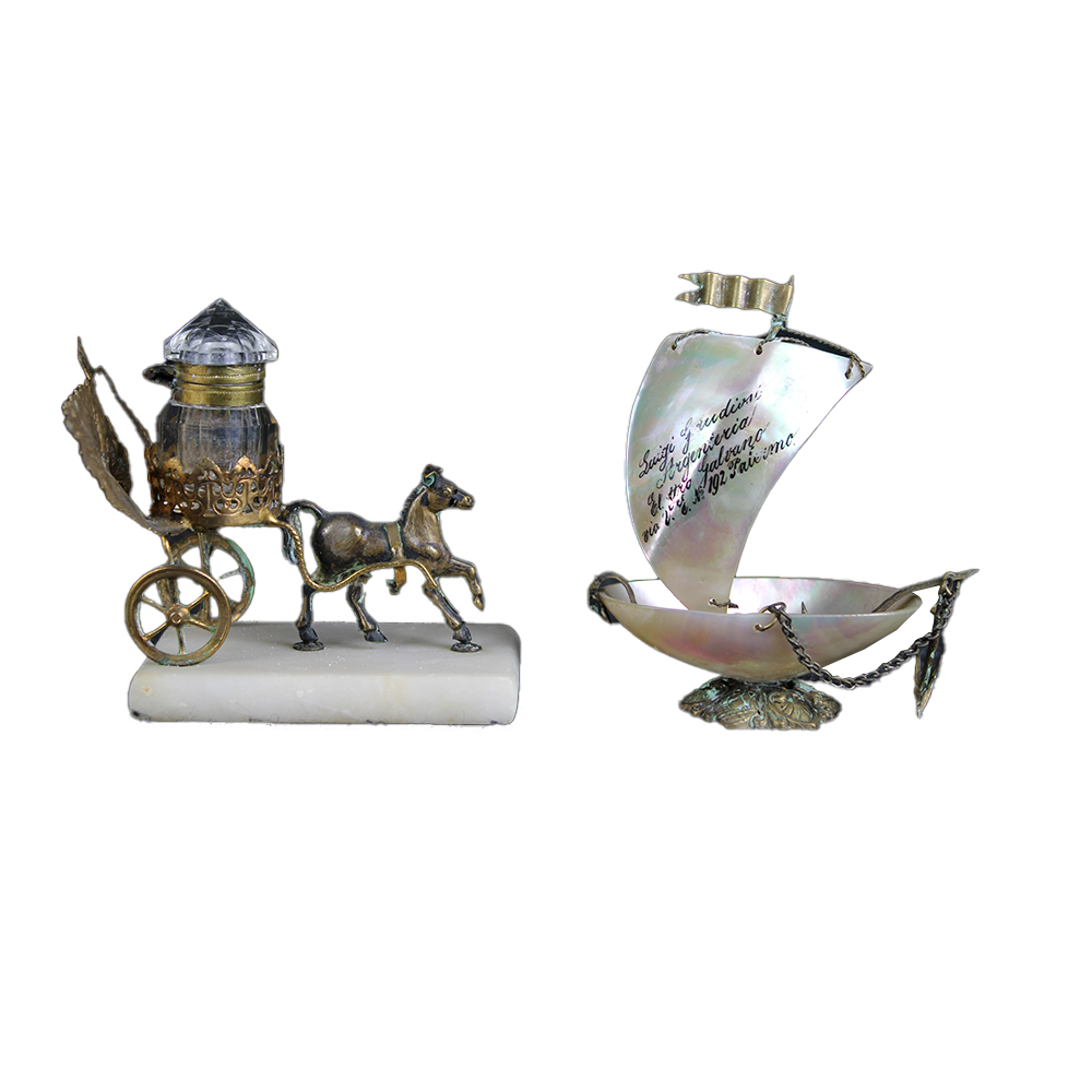 LOTTO COMPOSTO DA 1 curioso calamaio raffigurante cavallo con carrozza ad 1 oggetti in madreperla e metallo dorato raffigurante veliero maestranze italiane XX secolo h cm 9,5 x 9 x 4