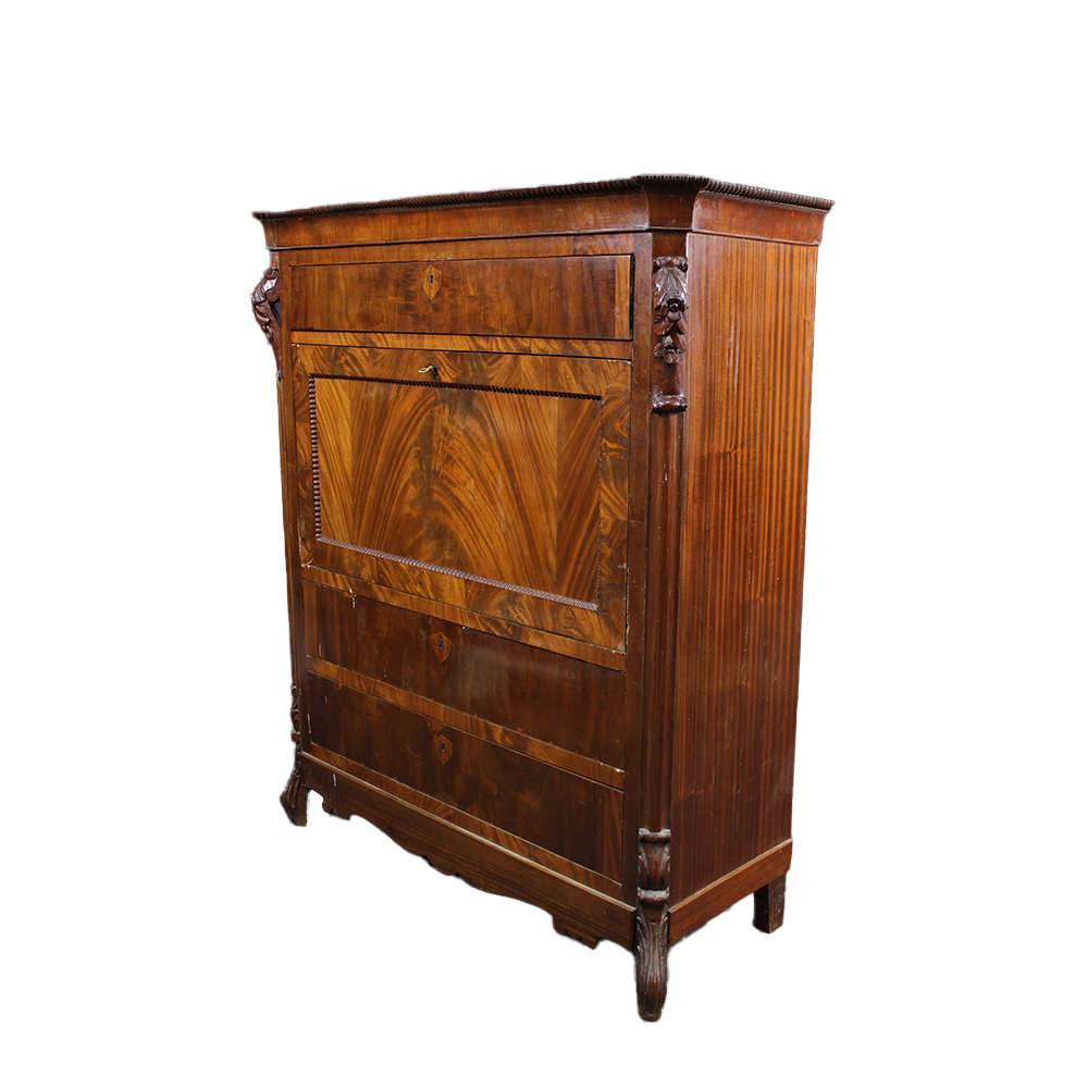CHIFFONIER in piuma di mogano composto da un cassetto nella parte superiore, anta a ribalta nella parte centrale e 2 cassetti nella parte inferiore maestranze siciliane primi 900 h cm 152 x 131 x 51