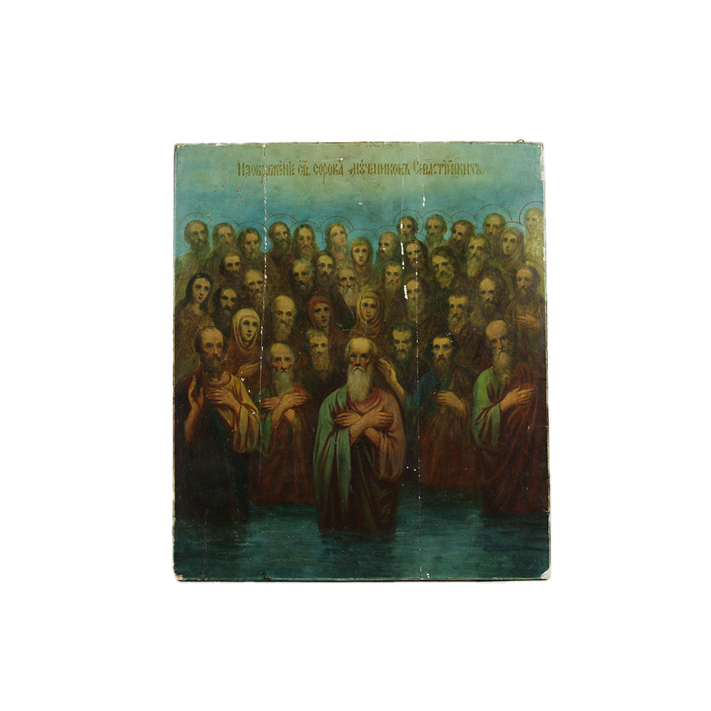 ICONA raffigurante i quaranta martini Sebaster, tempera su tavola con iscrizioni in caratteri cirillici dorati maestranze russe XIX secolo h cm 31,5 x 27