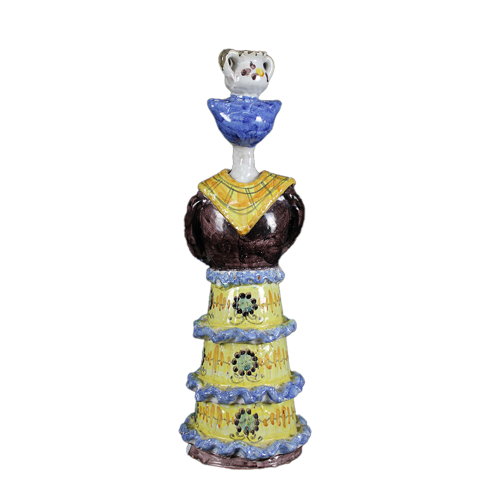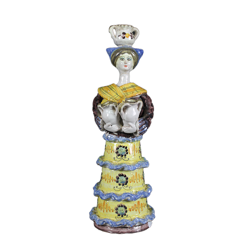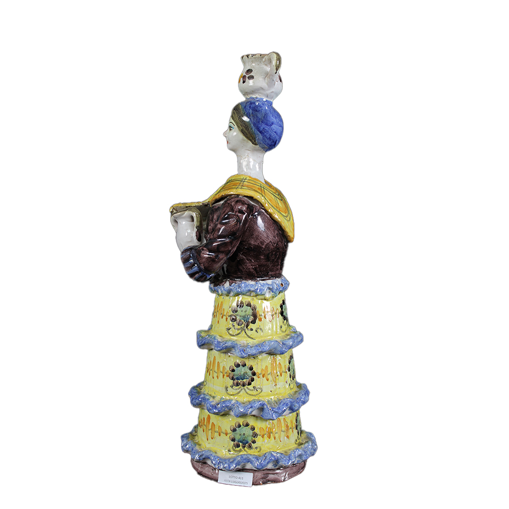 LUCERNA in maiolica policroma raffigurante acquaiola, incollaggi e usure del tempo maestranze siciliane primi 900 h cm 45 x Ø 15,5