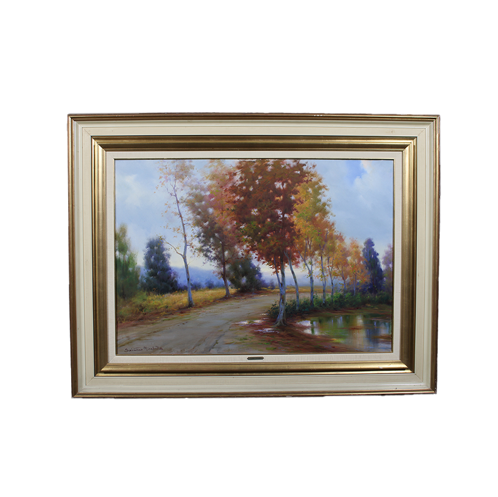 OLIO SU TELA raffigurante personaggio montano con strada alberata e laghetto dentro cornice laccata e dorata a firma Sebastiano Mirabella (Palermo 1902-1973)