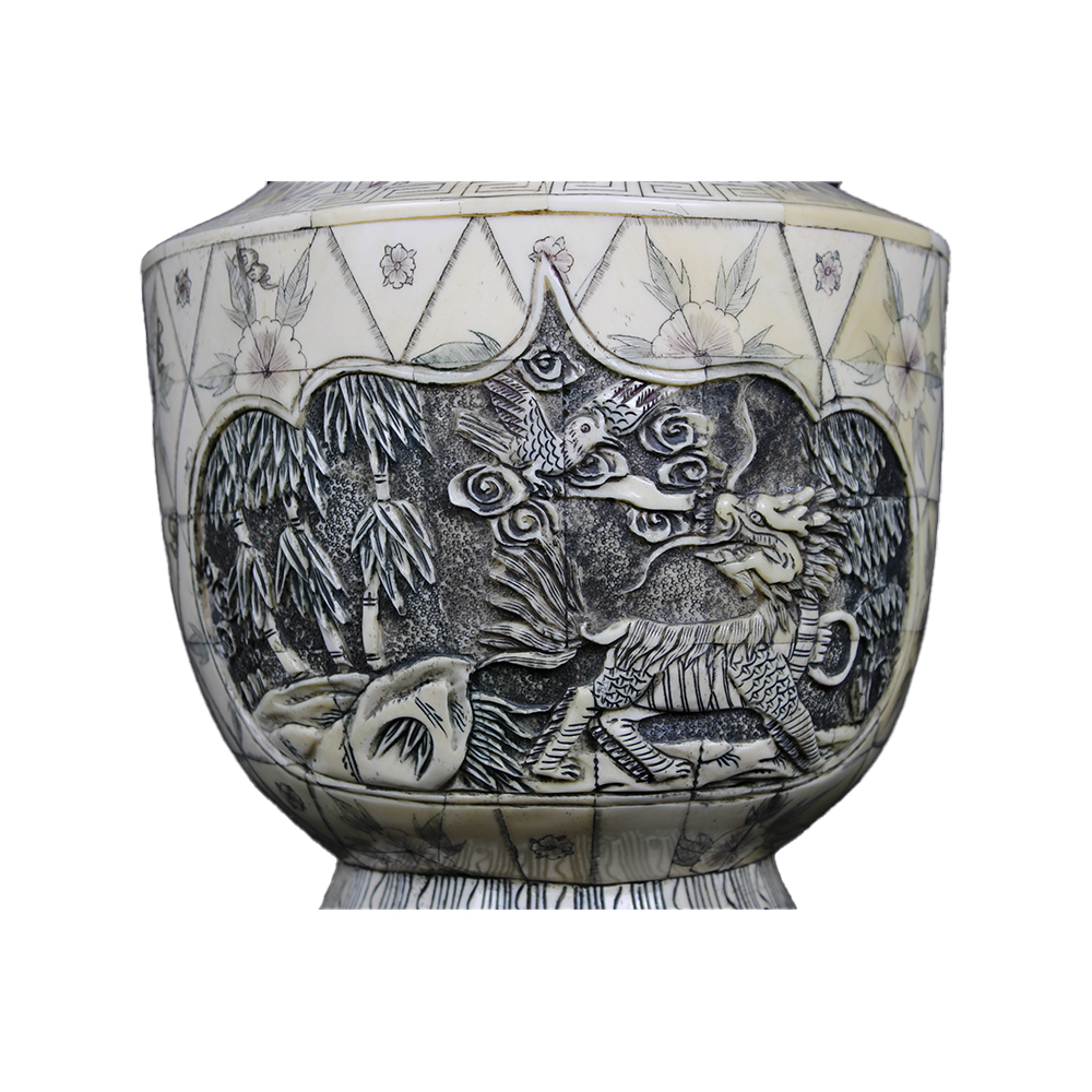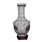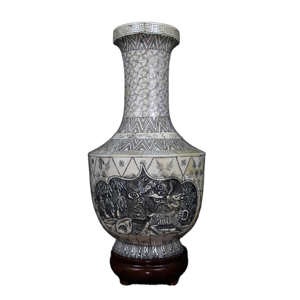 VASO in avoriolina scolpita e incisa con base in legno, rotture e mancanze al collo manifattura orientale XIX/XX secolo h cm 46,5 x 22