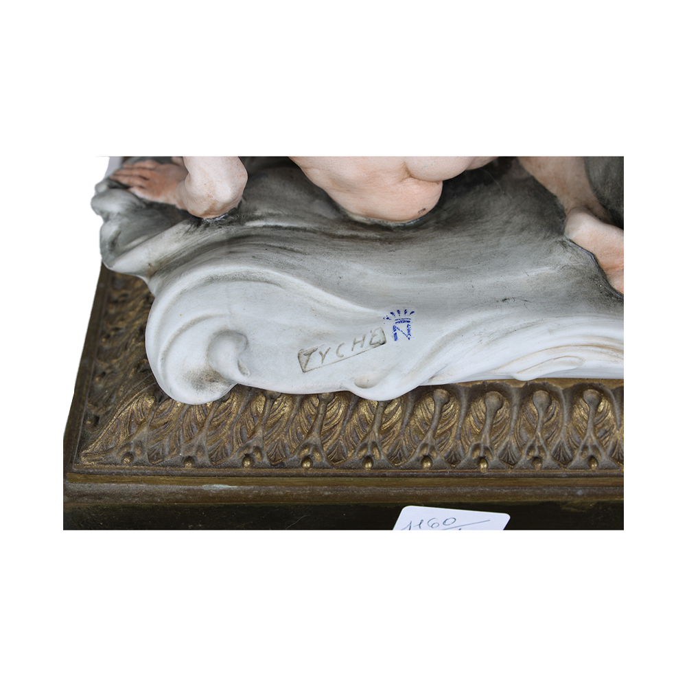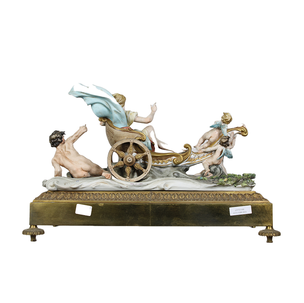 SCULTURA in porcellana policroma raffigurante allegoria classica con base in bronzo finemente cesellato e dorato manifattura Capodimonte, rotture e mancanze XX secolo h cm 27 x 45 x 21