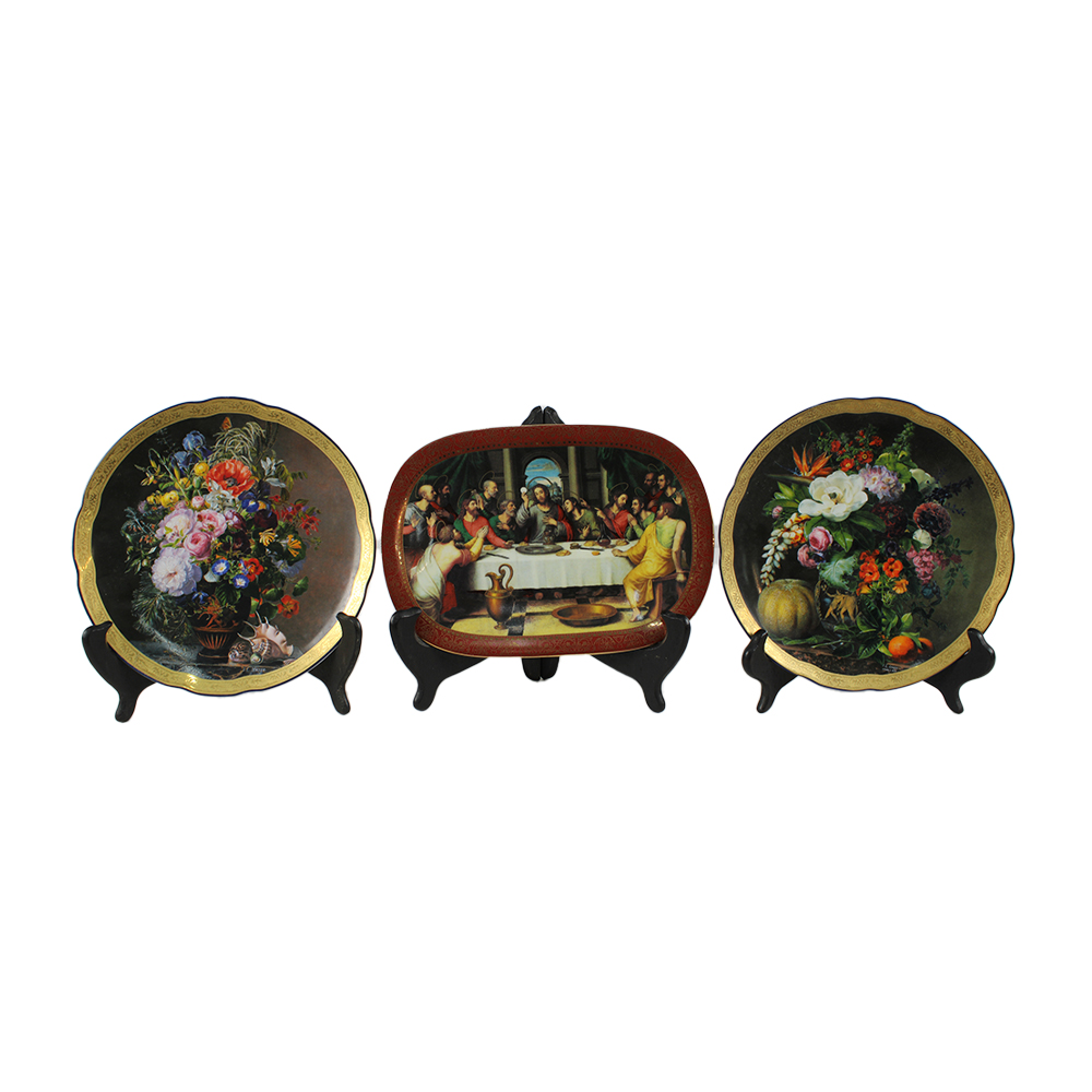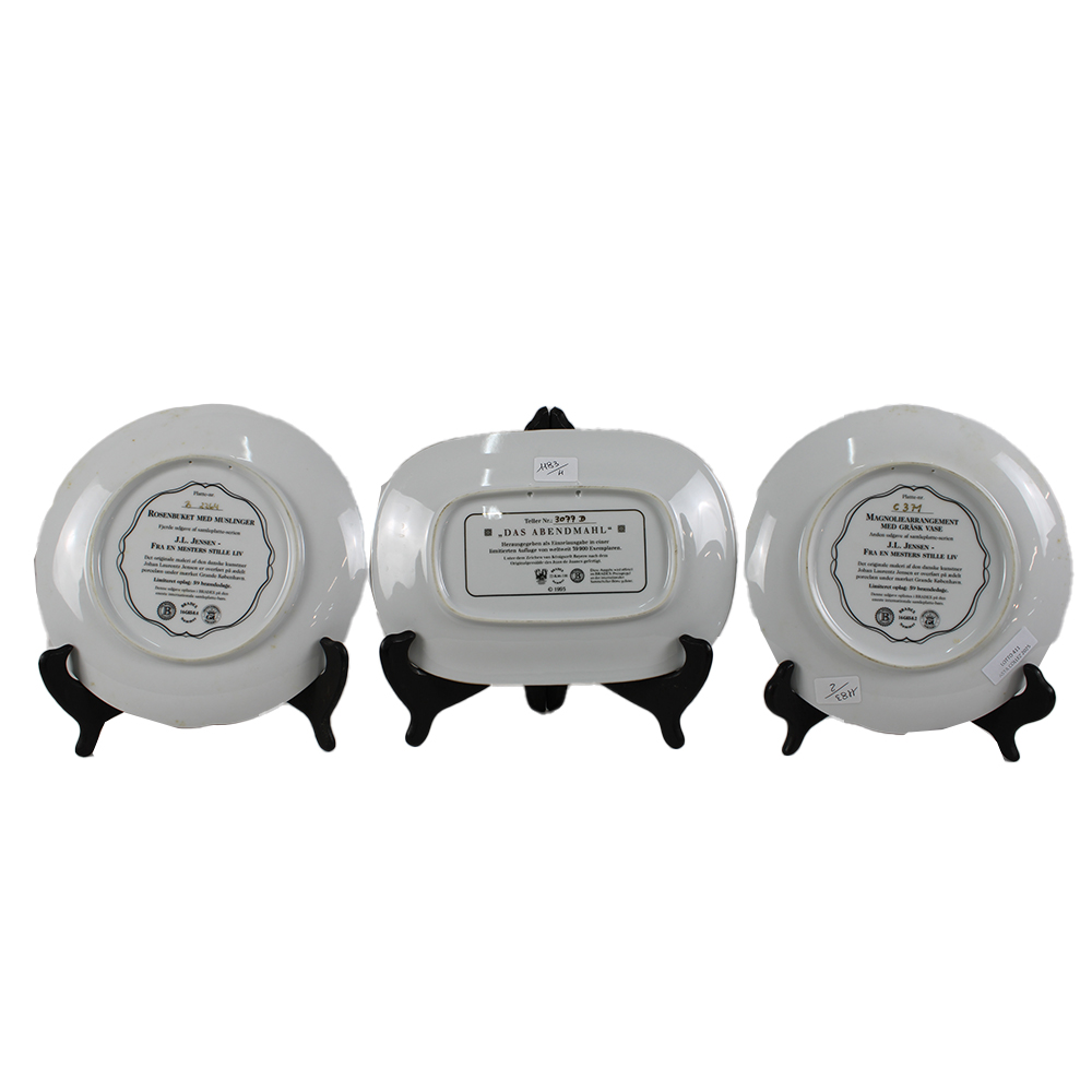 LOTTO COMPOSTO DA 2 piatti in porcellana dipinta raffigurante natura morta a firma Jansen e 1 vassoio raffigurante l'ultima cena e numerato 30773/39900 Grande Kopenaghen Anni 90 Danimarca D 20 - H 16 X 23
