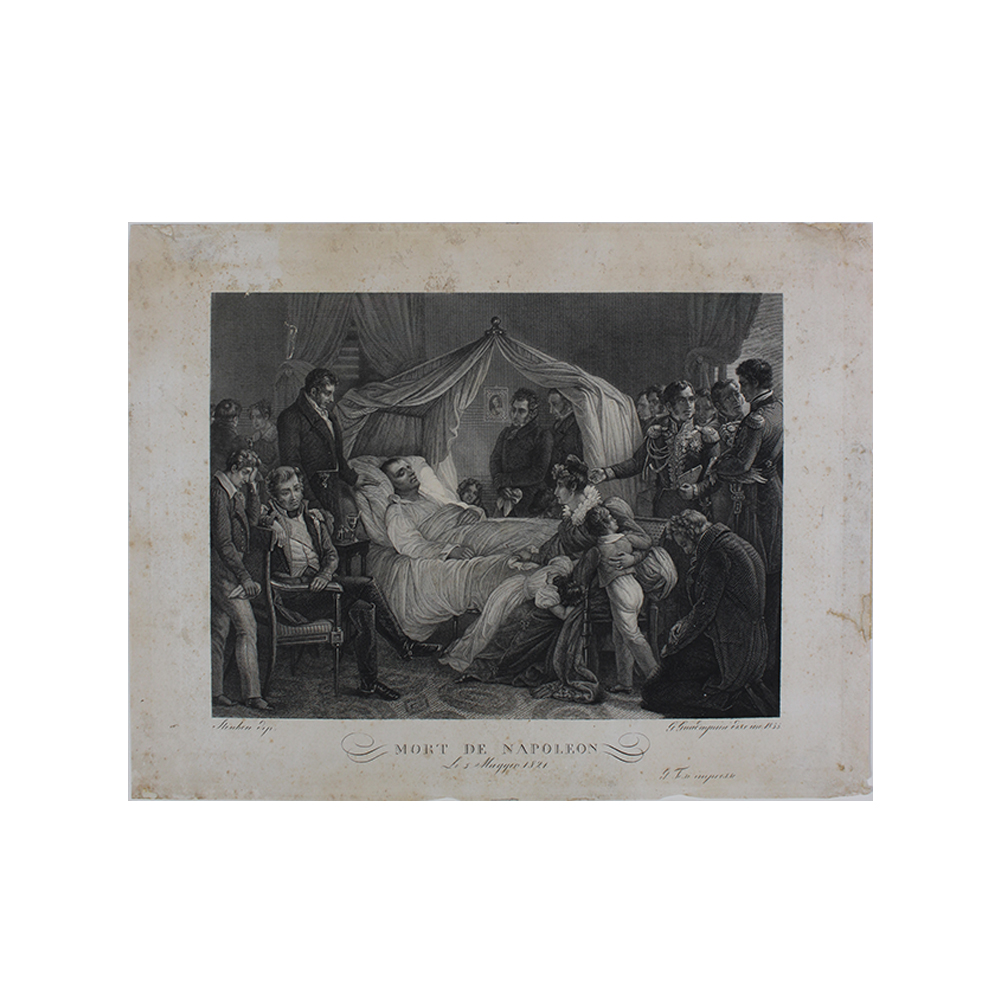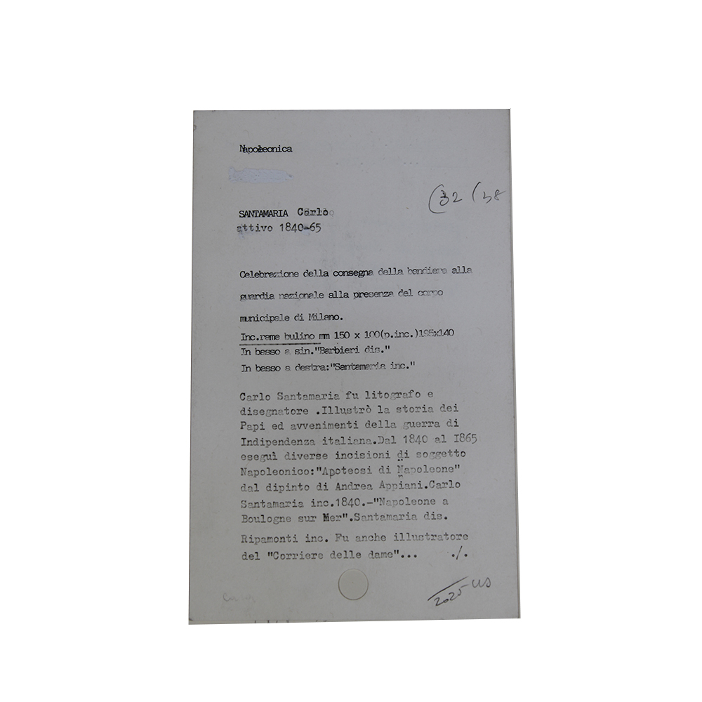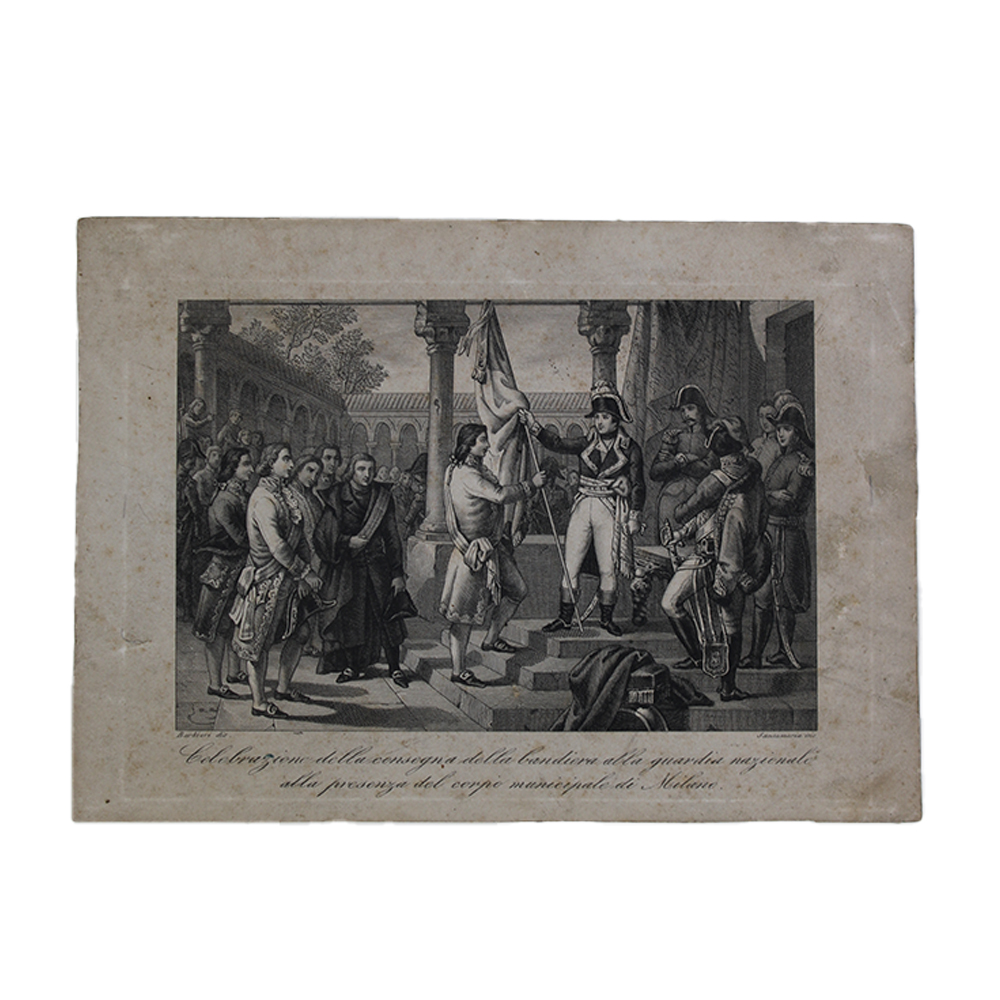 2 INCISIONI IN RAME Napoleonica Santamaria Carlo, celebrazione della consegna della bandiera alla guardia Nazionale e mort de Napoleon, allega foglietto descrittivo Italia XIX secolo h cm 23 x 30 - h cm 14 x 20