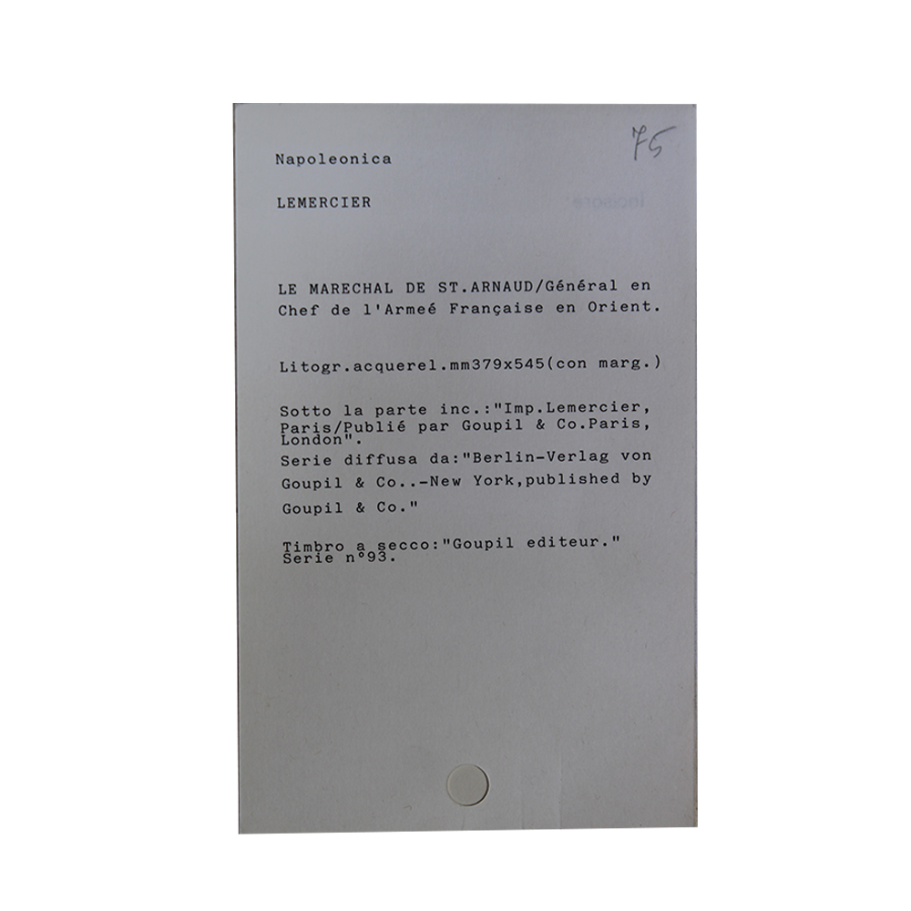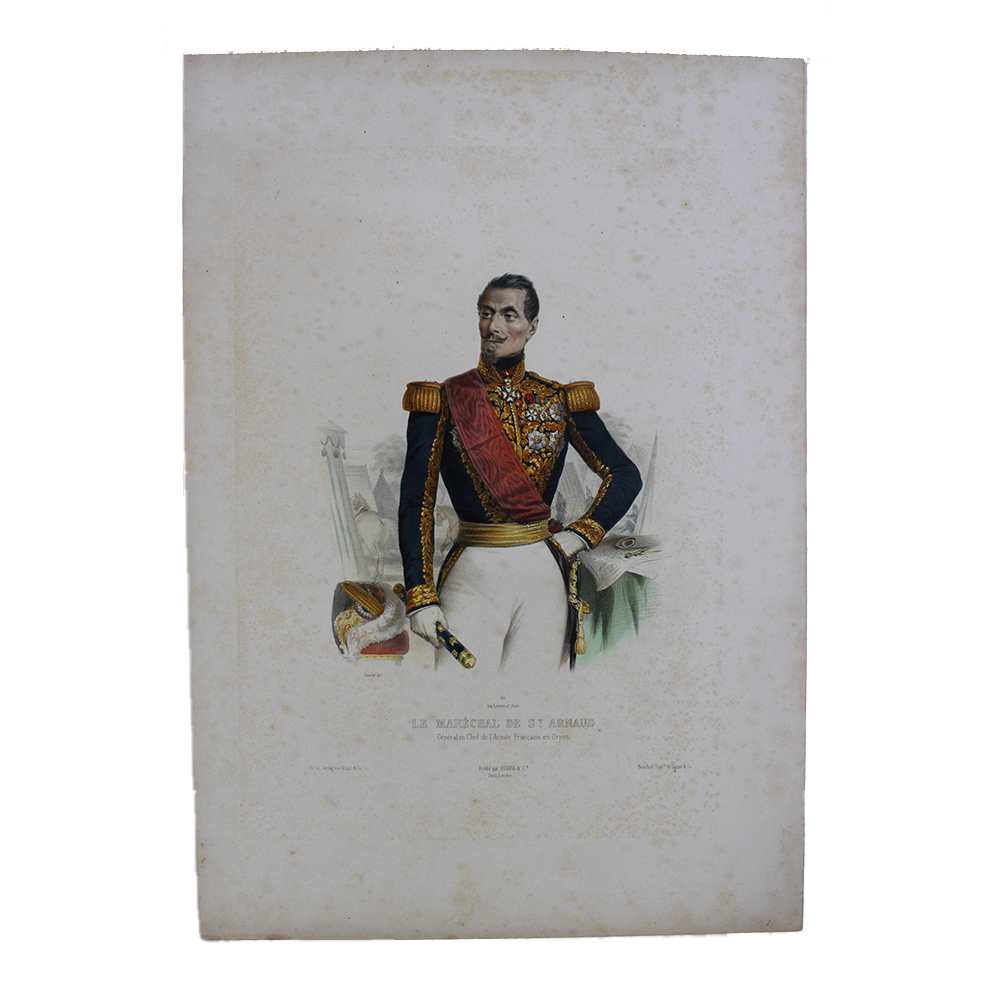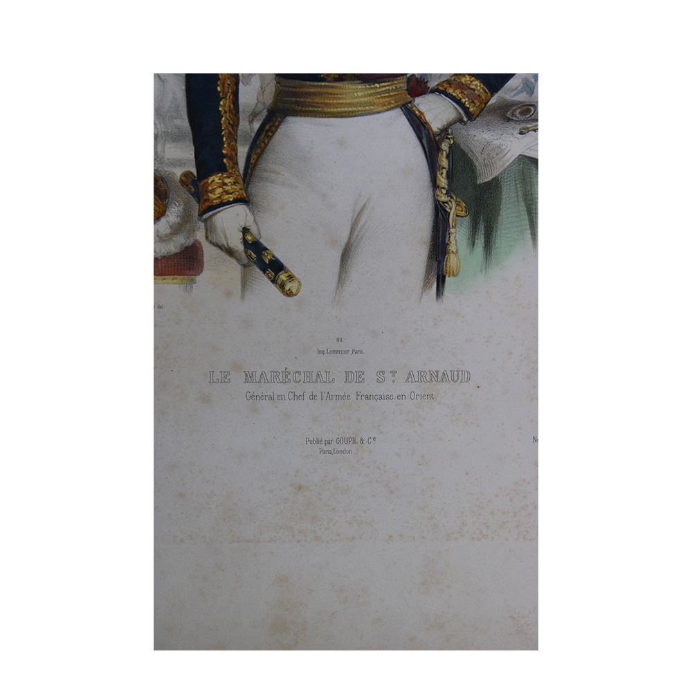LITOGRAFIA ACQUERELLO Napoleonica, Lemercier, Le Marechal de St.Arnaud, serie numero 93, diffusa da Goupil editeur, allega foglietto descrittivo Francia XIX secolo h cm 43 x 30