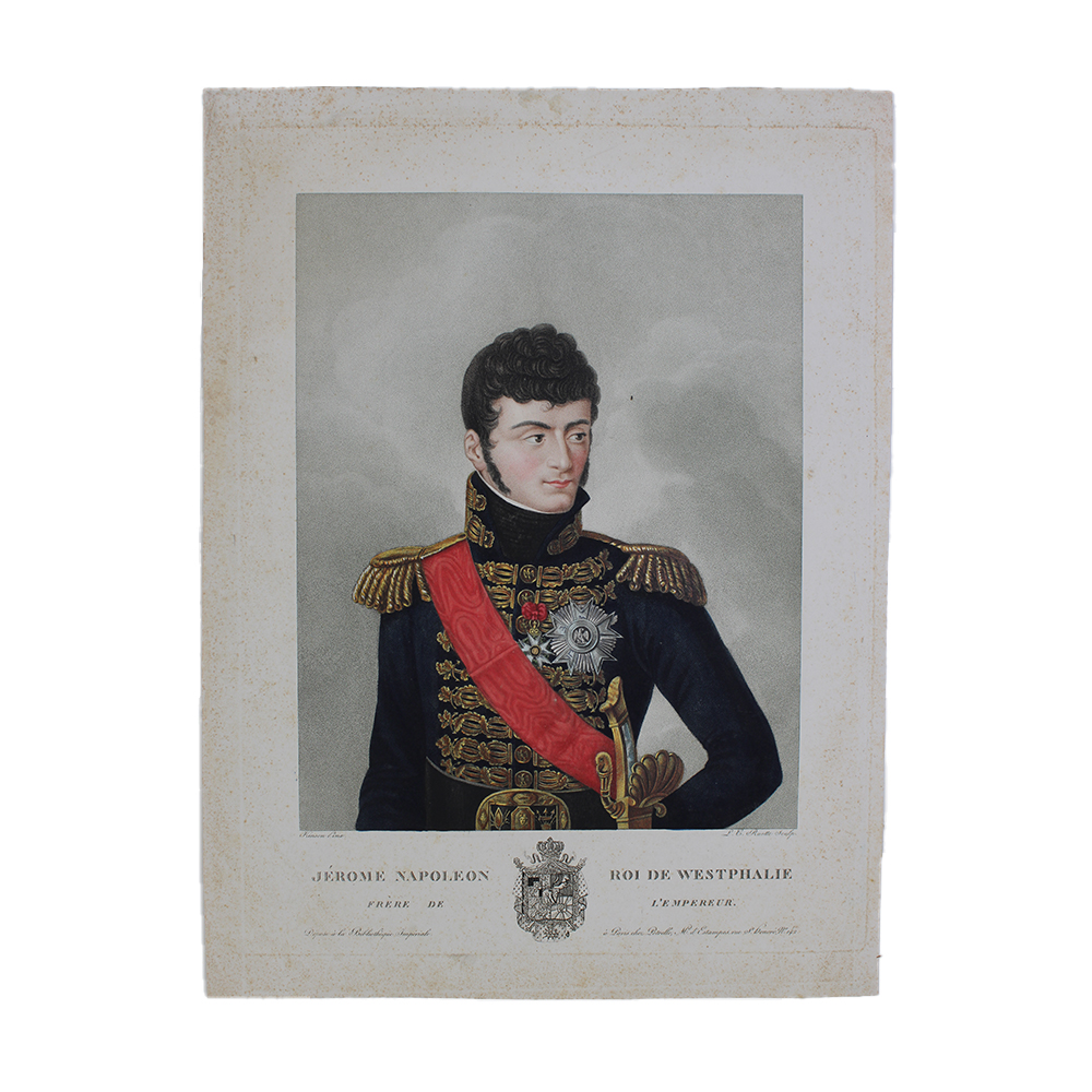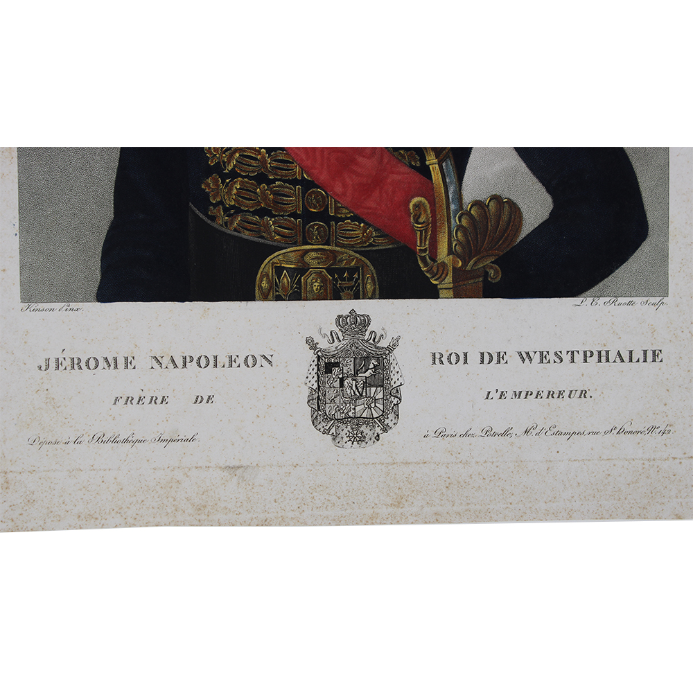 INCISIONE ACQUAFORTE . ACQUATINTA Napoleonica, Incisore Ruotte Louis Charles, Jerome Napoleon Roi de Westphalie, alega foglietto descrittivo Francia XIX secolo h cm 47 x 35