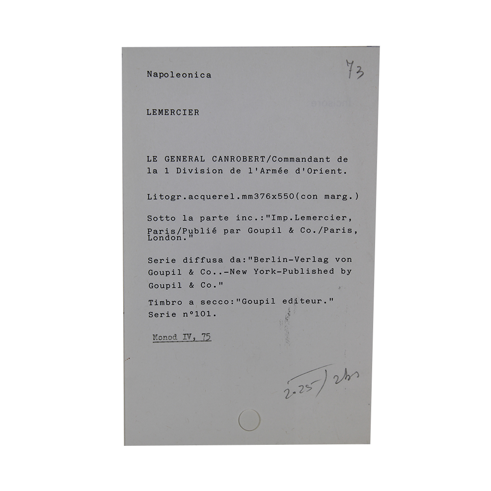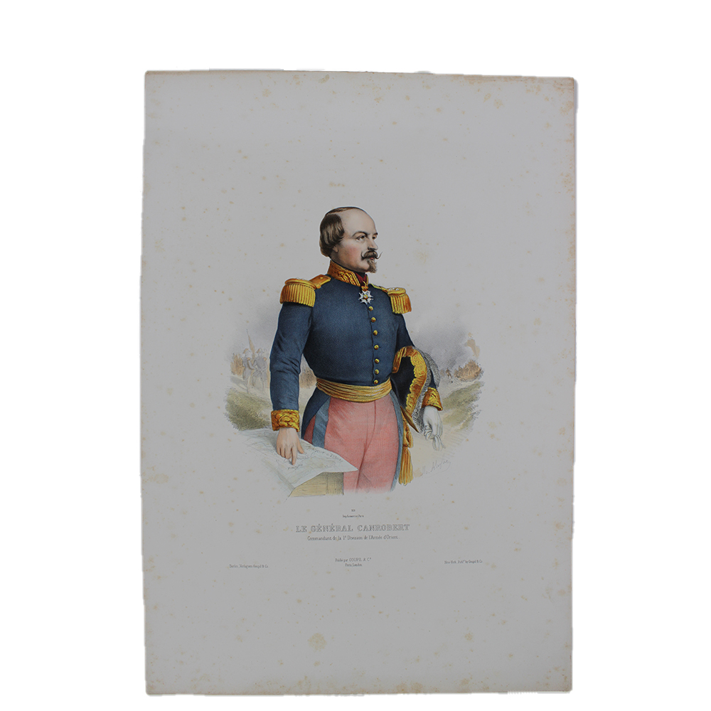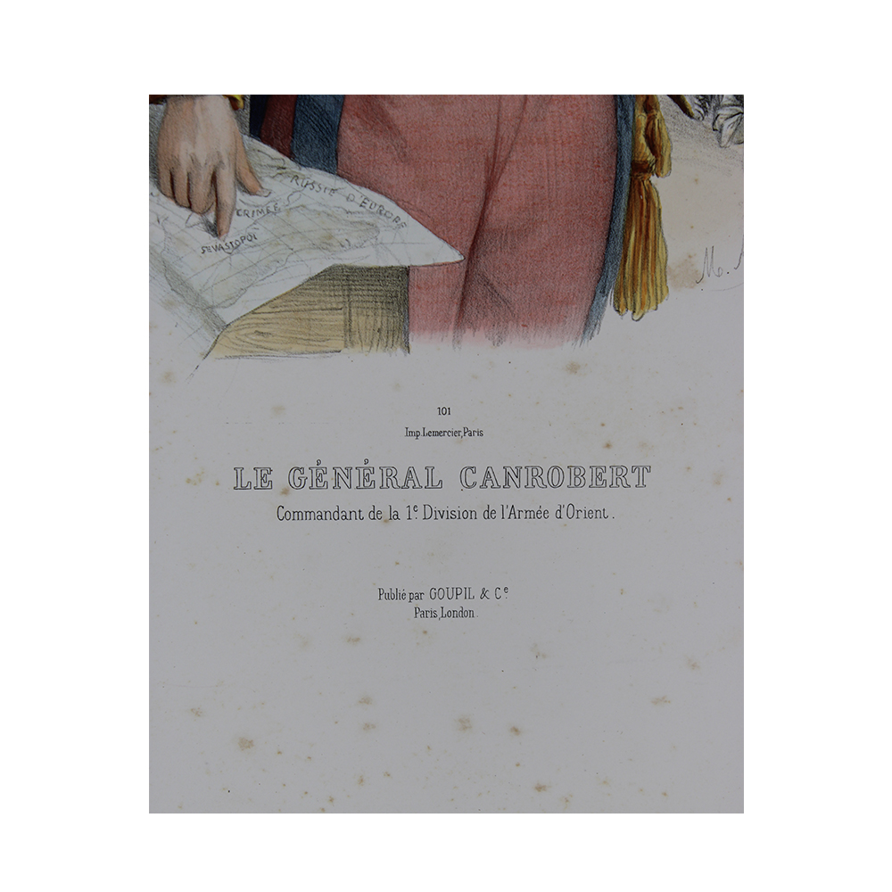 LITOGRAFIA ACQUERELLO Napoleonica, Lemercier, Le General Canrobert, serie numero 101, diffusa da Berlin-Verlag von Goupil, NY, timbro a secco, allega foglietto descrittivo Francia XIX secolo h cm 55 x 38