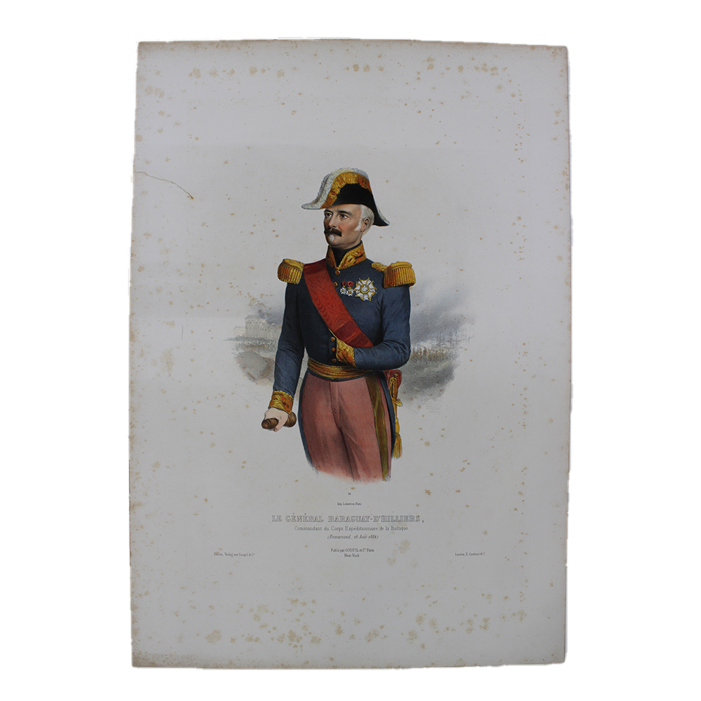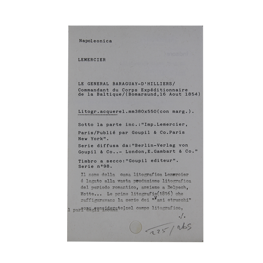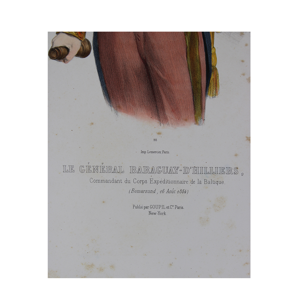 LITOGRAFIA ACQUERELLO Napoleonica, Lemercier, Le General Baraguay-D'Hilliers, serie numero 98, diffusa da Berlin-Verlag von Goupil,CO, timbro a secco, allega foglietto descrittivo Francia XIX secolo h cm 55 x 38