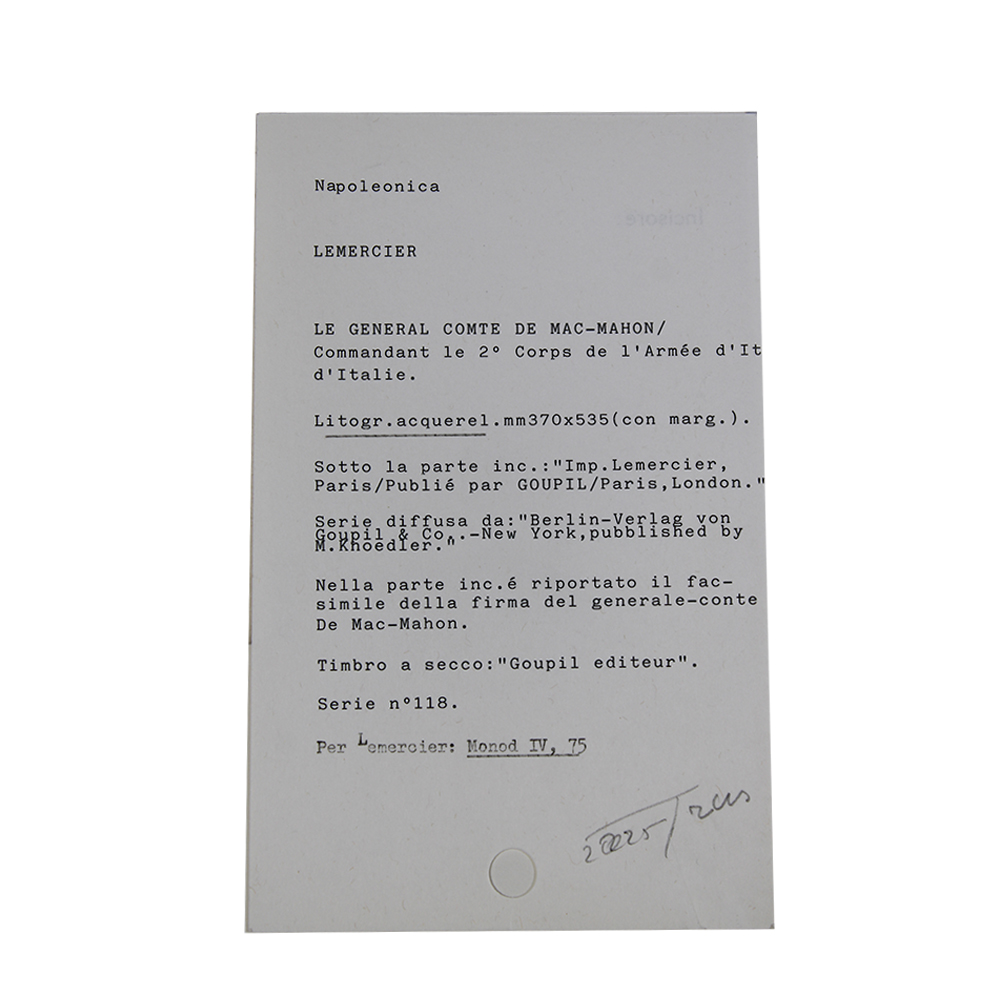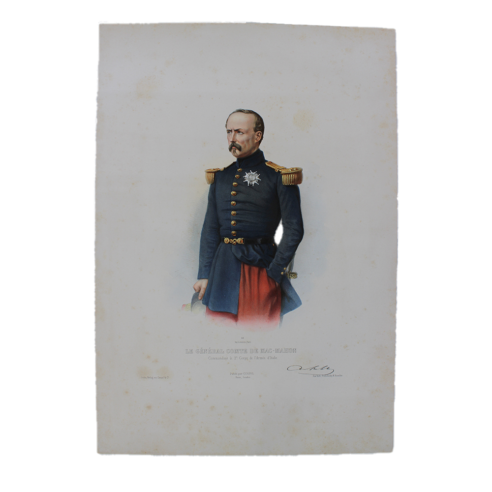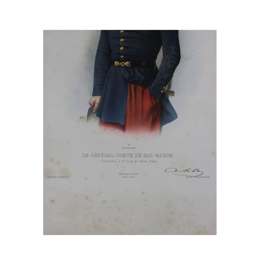 LITOGRAFIA ACQUERELLO Napoleonica, Lemercier, Le General Conte De Mac-Mahon, serie numero 118, diffusa Berlin-Verlag von Goupil,NY, pubblicata da M.Knoedler, timbro a secco, allega foglietto descrittivo Francia XIX secolo h cm 53,5 x 37,5