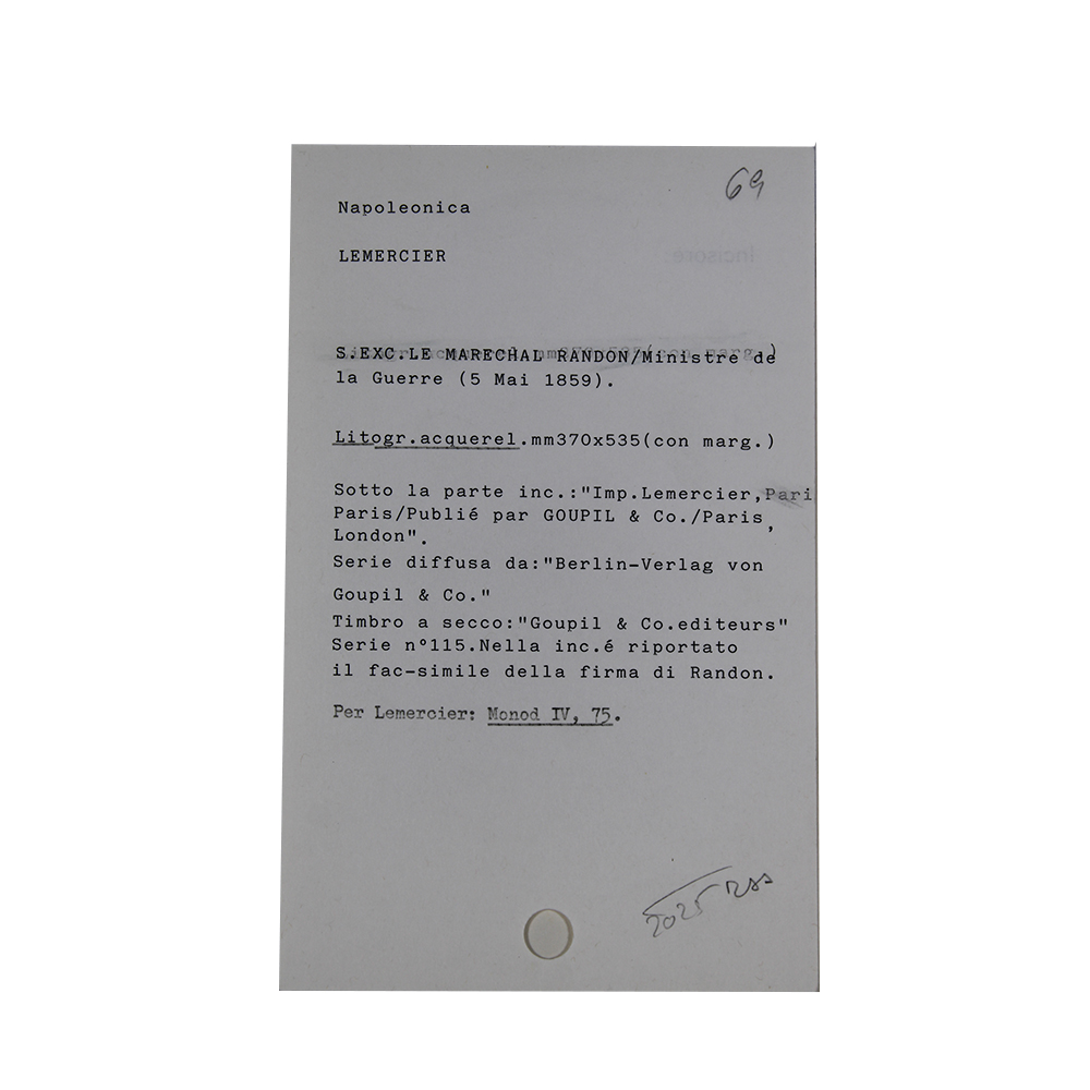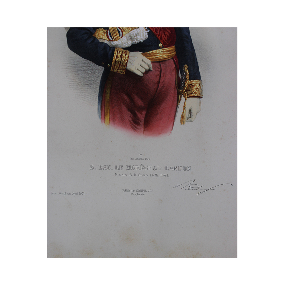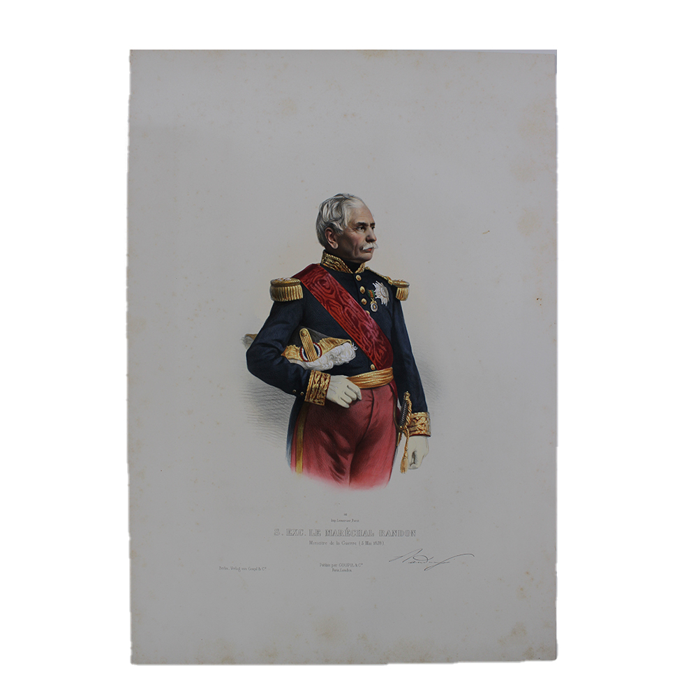 LITOGRAFIA ACQUERELLO Napoleonica, Lemercier, S. Exc. Le Marechal Randon, Ministre de la Guerre, serie numero 115, diffusa da Berlin-Verlag von Goupil e CO, timbro a secco, allega foglietto descrittivo Francia XIX secolo h cm 53,5 x 37,5