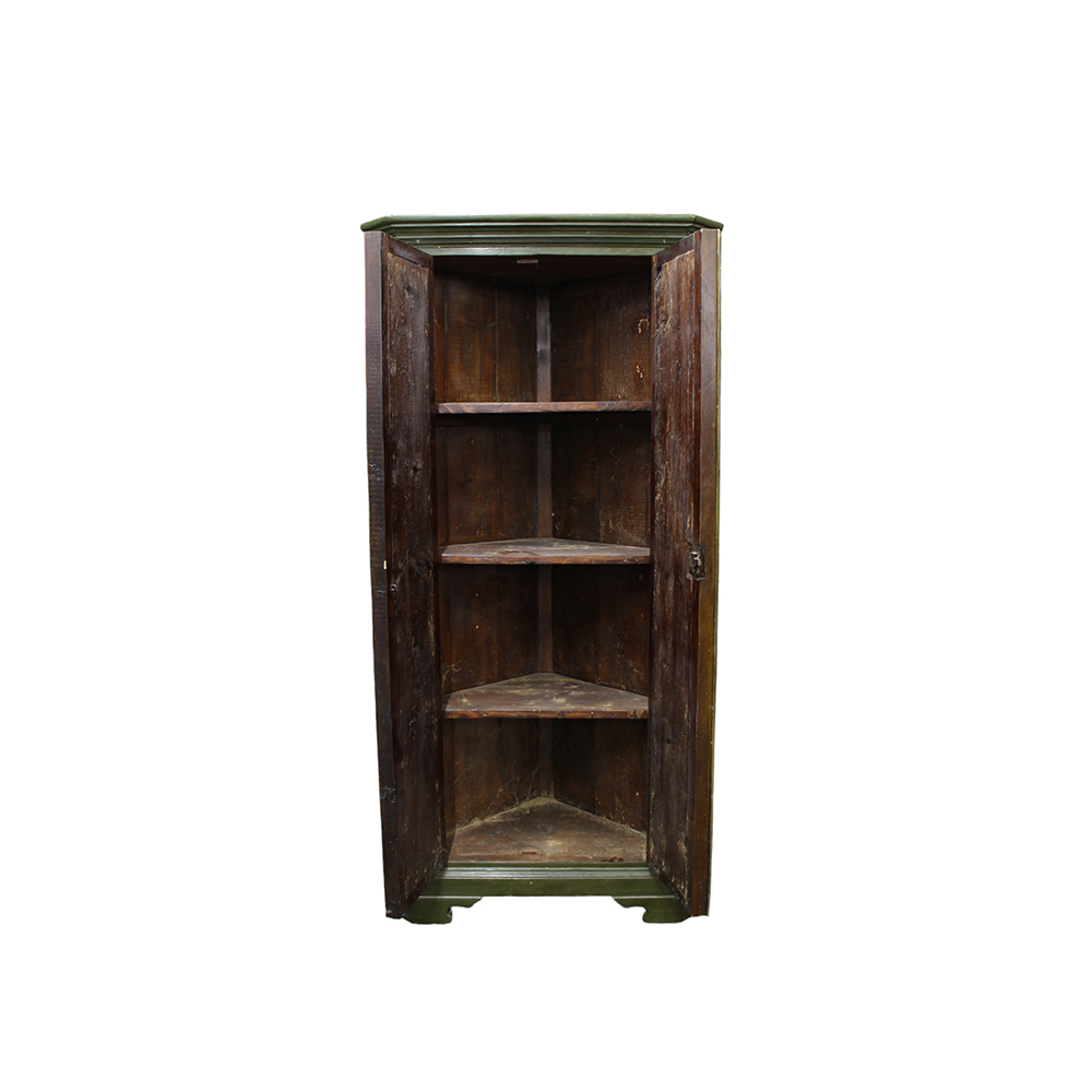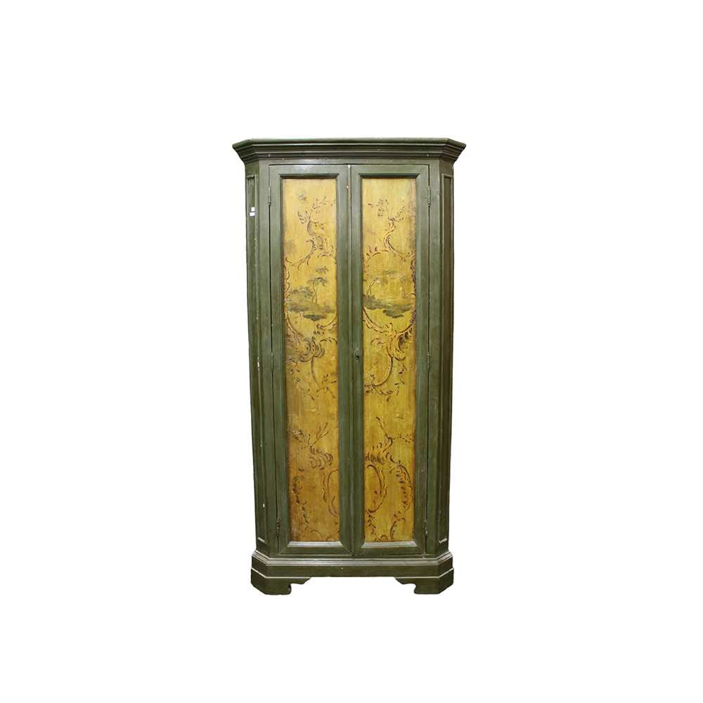 MOBILE CANTONALE AD ANGOLO A 2 ANTE in legno laccato a fondo verde e dipinto a cartigli dentro riserve paesaggi , usure del tempo e vecchi restauri maestranze siciliane XVIII secolo h cm 206 x 103 x 65