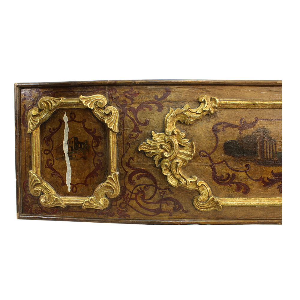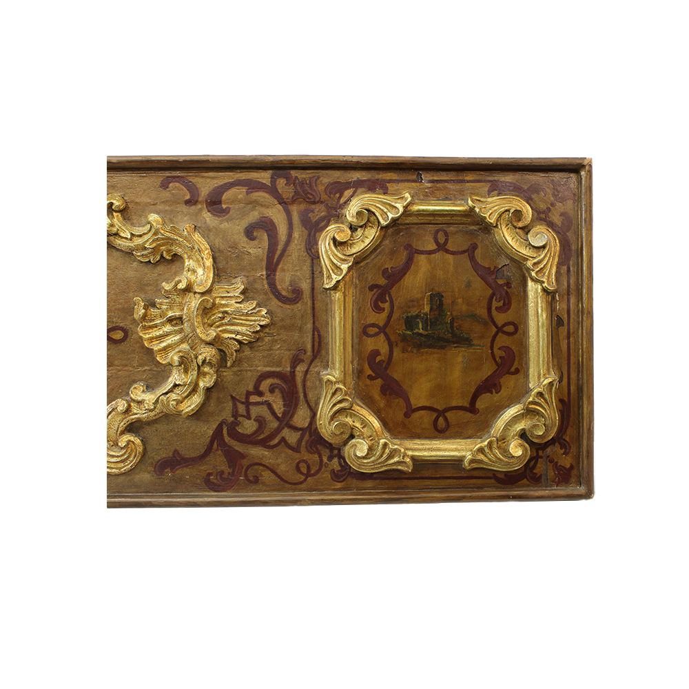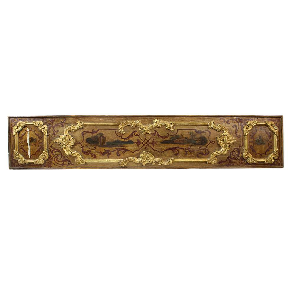 PANNELLO DECORATIVO in legno scolpito laccato dipinto e dorato ad argento e mecca raffiguranti paesaggi maestranze siciliane XVIII secolo h cm 250 x 48 x 4