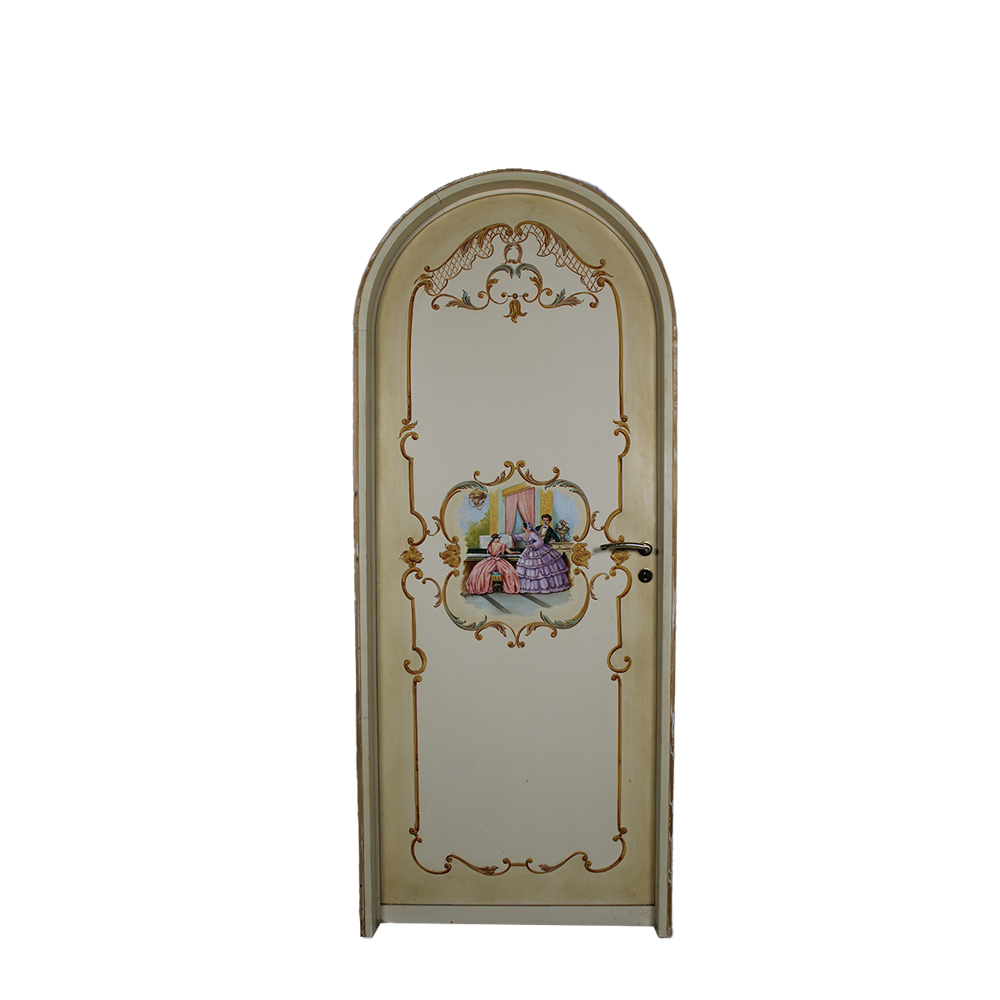 PORTA AD ARCO in legno laccato e dipinto raffigurante dentro riserva scene neoclassiche e decori grotteschi, sul retro pannello in legno grezzo, completa di sagome e serramenti maestranze siciliane primi 900 h cm 214 x 88 x 10