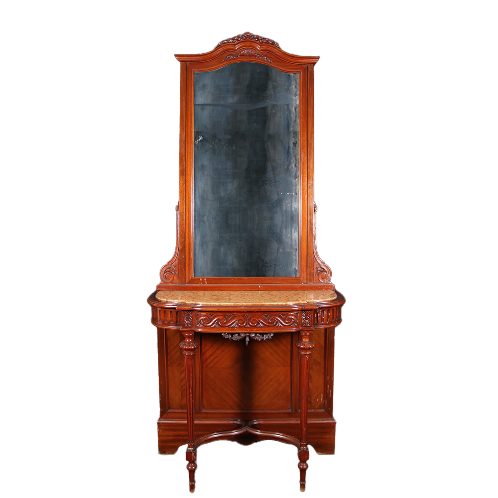 CONSOLLE CON SPECCHIERA in legno di mogano scolpiti con piano in marmo rosso di Verona Italia II metà del XIX secolo