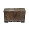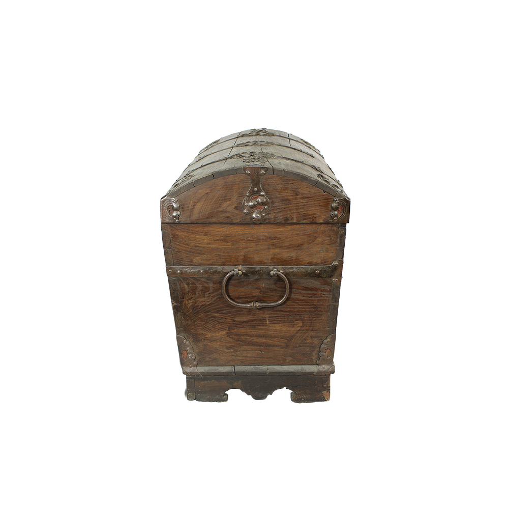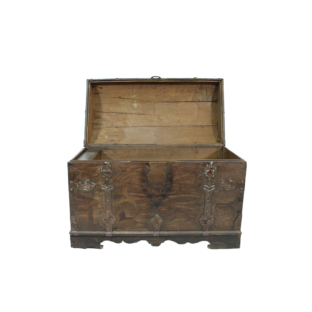 BAULE DA VIAGGIO in legno di castagno arricchito da borchie e decorazioni in ferro battuto maestranze Nord Europa XIX secolo h cm 81 x 118 x 58