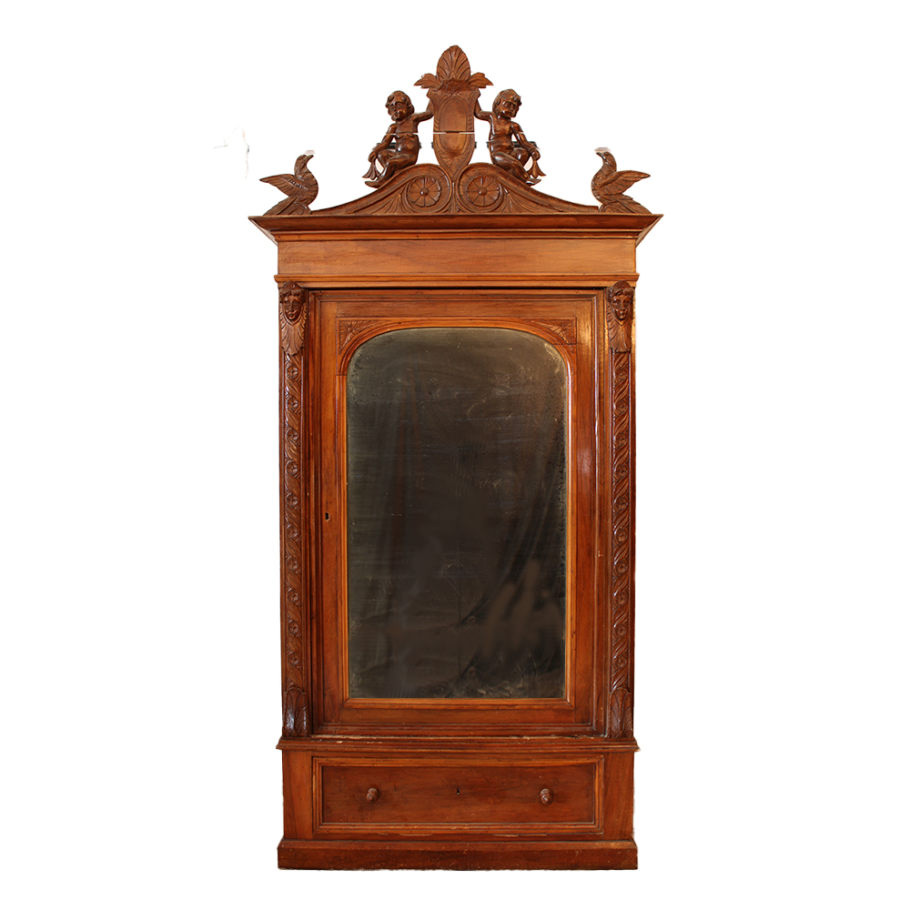 ARMADIO in legno di noce riccamente scolpito ad un anta a specchio e 1 cassetto maestranze siciliane XIX secolo h cm 270 x 133 x 60