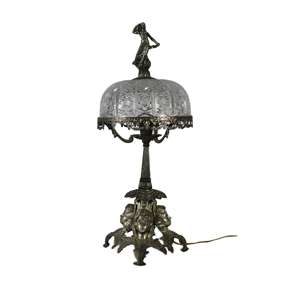 LUME DA TAVOLO in fusione di metallo argentato con paralume in cristallo intagliato Italia primi 900 h cm 52 x 20